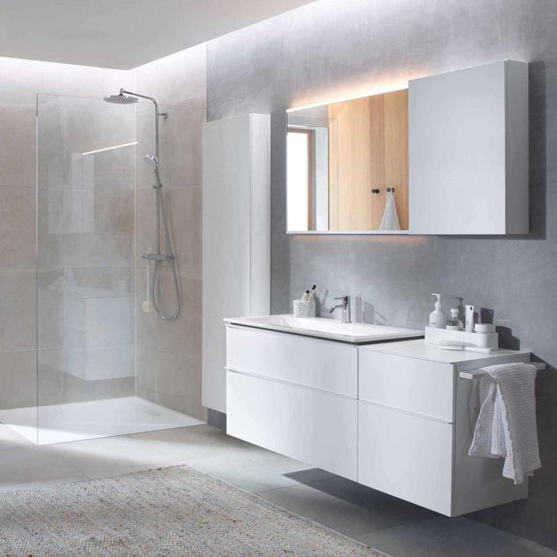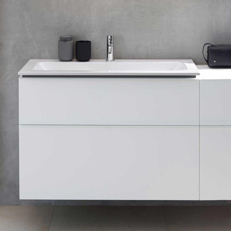 Badmöbel Set bestehend aus Keramik Waschtisch mit Unterschrank, wandhängend, mit zwei Schubladen, Keramik Waschtisch mit schmalem Rand, Schublade mit Selbsteinzug, Griff, Schublade ohne Geruchsverschlussausschnitt, Waschtischunterschrank aus hochverdichteter Dreischicht-Holzspanplatte, Feuchtigkeitsbeständig| Hersteller: | Geberit |