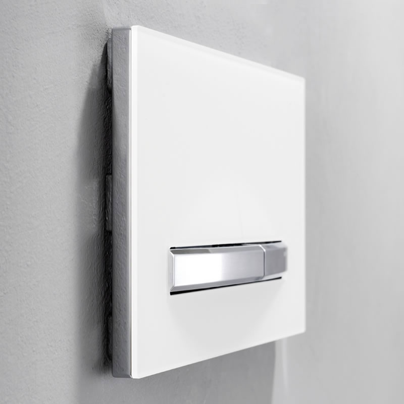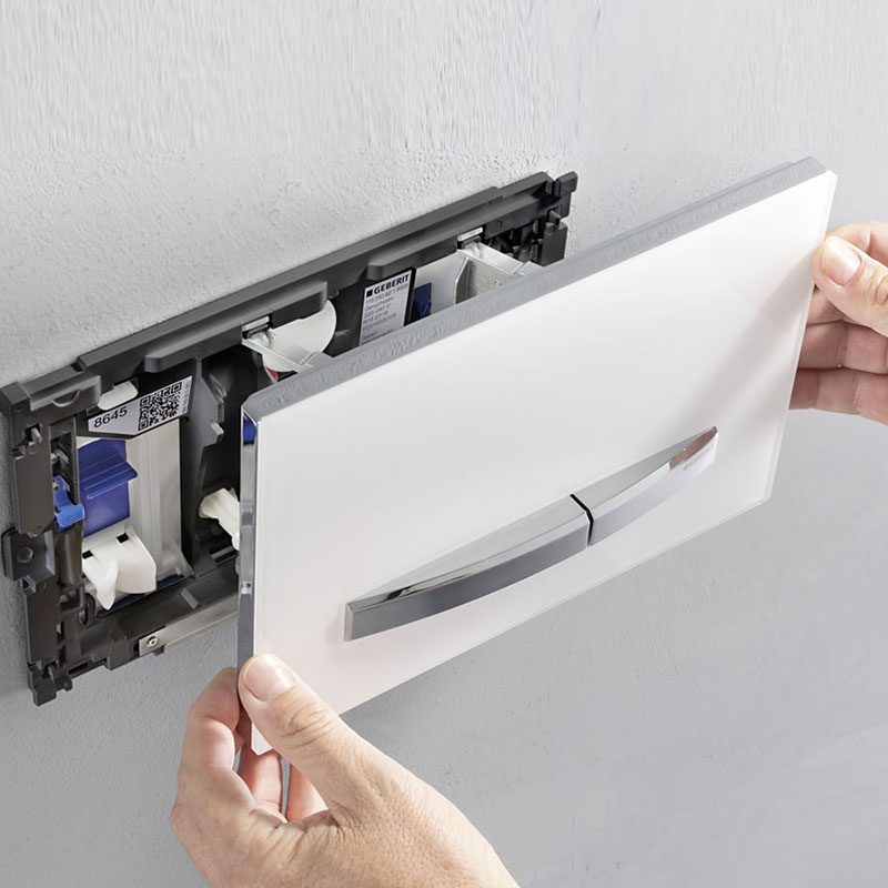 Zur Spülauslösung bei Geberit Sigma UP-Spülkästen, Betätigung von vorne, Drückerstangen schallgedämmt, werkzeuglose Schnelleinstellung