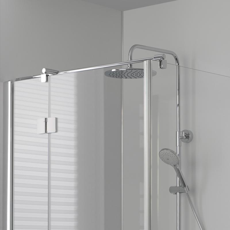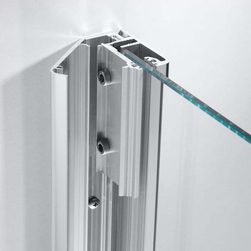 Aperto Drehtür pendelbar an Nebenteil mit Seitenwand mit 8 mm Seitenteil und 6 mm Pendeltür aus Einscheiben-Sicherheitsglas (ESG), mit innen glasbündigen Scharnieren und Clipsprofil. Zur Montage auf einer Duschwanne. Dank des Clipsprofils ist die Montage sehr einfach und die Schrauben werden durch das Clipsprofil verdeckt. Flächenbüniger Scharnier mit Heb,- Senkmechanismus. Beim Öffnen werden die Türen angehoben, beim Schließen senken sich diese ab. Zwei formschöne Bügelgriffe vermitteln eine angenehme Haptik.