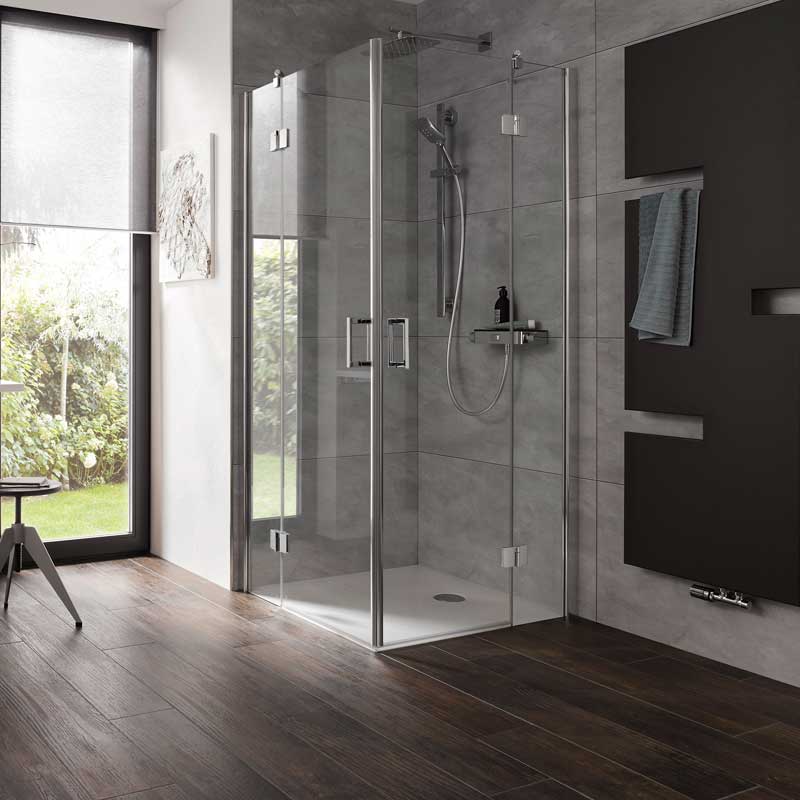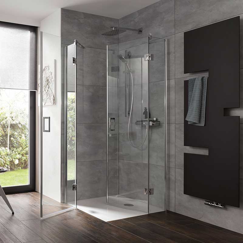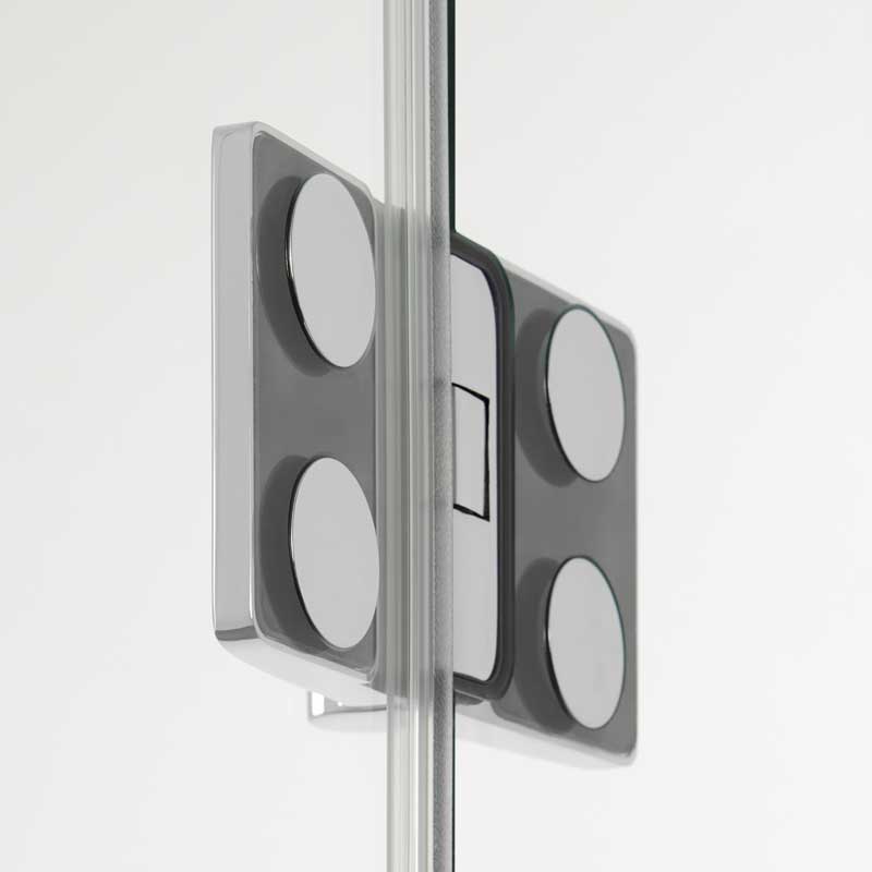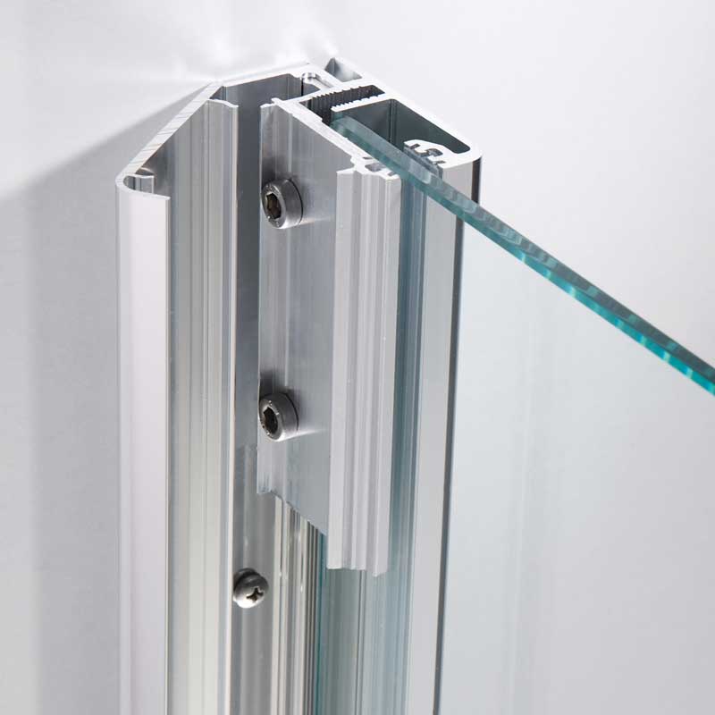 Ein komfortabler Einstieg in jede Raumsituation: Das Aperto Scharnier ermöglicht eine Türöffnung nach außen sowie innen und damit vielfältige Gestaltungsmöglichkeiten.Eckeinsteig Aperto 4 teilig mit 8 mm Seitenteilen und 6 mm Pendeltüren aus Einscheiben-Sicherheitsglas (ESG), mit innen glasbündigen Scharnieren und Clipsprofil. Zur Montage auf einer Duschwanne. Dank des Clipsprofils ist die Montage sehr einfach und die Schrauben werden durch das Clipsprofil verdeckt. Flächenbüniger Scharnier mit Heb,- Senkmechanismus. Beim Öffnen werden die Türen angehoben, beim Schließen senken sich diese ab. Zwei formschöne Bügelgriffe vermitteln eine angenehme Haptik.