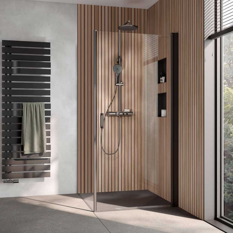 Die HSK Exklusiv 2.0 Drehtür ist zur Kombination mit einer Seitenwand gedacht. Die einflügelige Drehtür erlaubt einen sehr großzügigen Einstieg in die Dusche und ist auch in Sachen Pflege, dank einer durchgehenden Glasscheibe sehr reinigungsfreundlich. Direkt neben der Dusche können Heizkörper oder Möbel ihren Platz finden, ohne den Komfort eines großen Einstieges zu reduzieren.