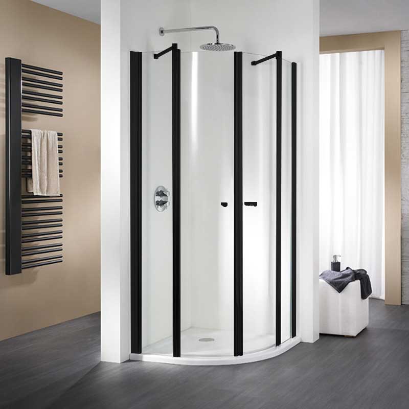 Runddusche, 4-teilig, mit je 2 pendelbaren Drehtüren je an einem Nebenteil, Heb-Senk Mechanismus im Profil, sehr Montagefreundlich