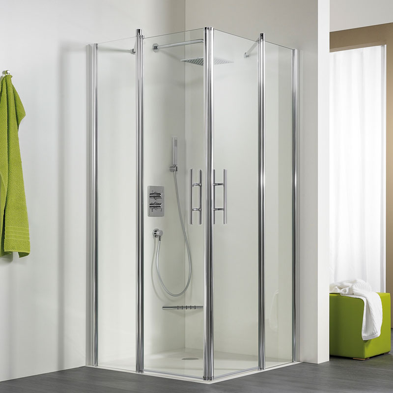 | Bauweise: | Eckeinstieg Duschkabine, 4-teilig, mit je 2 pendelbaren Drehtüren je an einem Nebenteil, Heb-Senk Mechanismus im Profil, sehr Montagefreundlich | ||||