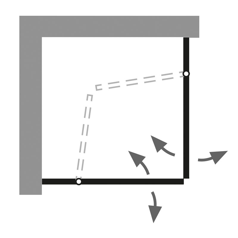 | Bauweise: | Eckeinstieg Duschkabine, 4-teilig, mit je 2 pendelbaren Drehtüren je an einem Nebenteil, Heb-Senk Mechanismus im Profil, sehr Montagefreundlich | ||||
