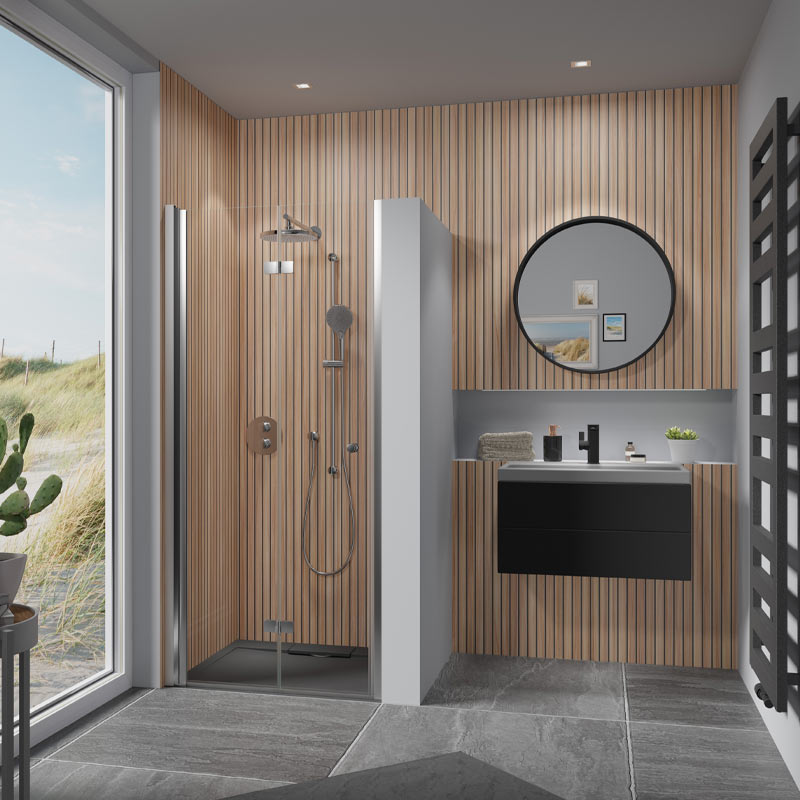 Mit einer Höhe von 195 cm eignet sich diese Dreh- und Pendeltürlösung auch ideal für großzügige Duschbereiche.