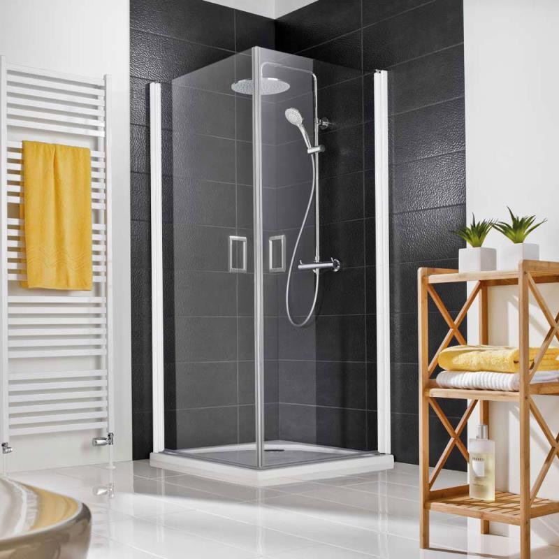 Eckeinstieg mit 2 Pendeltüren, Türen können nach Innen und Außen geöffnet werden, nach dem Duschen können diese nach Innen geöffnet stehen bleiben, dies trägt zur Abtrocknung der Dusche bei, Türen direkt an der Wand angebunden, mit Heb- Senkmechanismus und ansprechenden Stabgriff