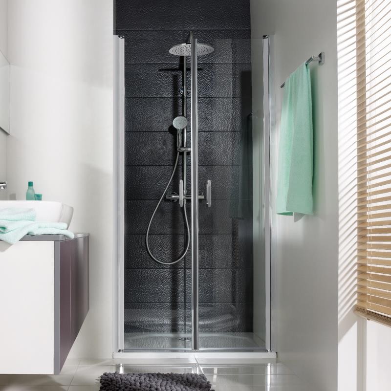Die 2 Türflügel verfügen über einen 180° Scharnier und lassen sich nach Innen und nach Außen öffnen. Als sehr Praktisch erweist sich diese Technik. Nach dem Duschen lassen Sie die Türen einfach nach Innen geöffnet stehen und die Dusche trocknet schnell ab. Ein integrierter Heb- Senk Mechanismus, schon die unter Wasserleisten und erhöht die Dichtigkeit. 5 mm starkes Einscheiben Sicherheitsglas sorgt für hohe Transparenz im Badezimmer und Stabilität. Ein formschöner und stabiler Stangengriff gewährt angenehmes Öffnen und Schließen dieser Dusche.