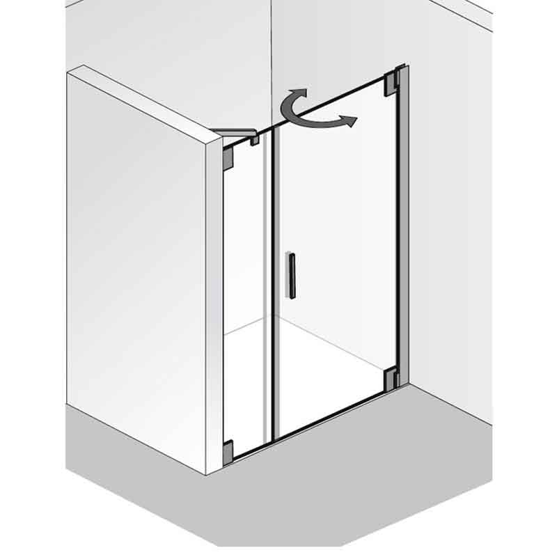 | Bauweise: | Pendelbare Drehtür mit 1 Festelement direkt an der Wand angeschlagen, 180° Scharniere, Innenglasbündige Scharniere, Clipsprofil als Wandanschluß, Montagefreundlich | ||||