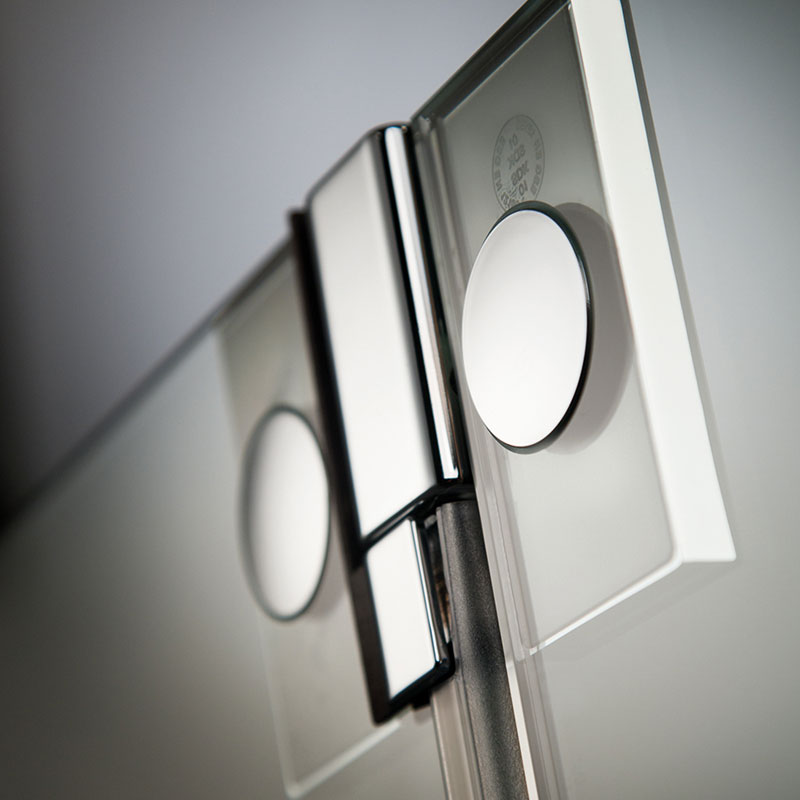 | Bauweise: | Pendelbare Drehtür mit 1 Festelement direkt an der Wand angeschlagen, 180° Scharniere, Innenglasbündige Scharniere, Clipsprofil als Wandanschluß, Montagefreundlich | ||||