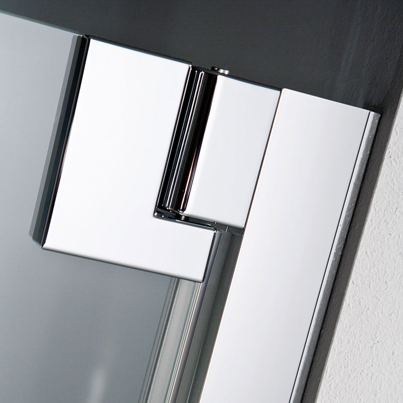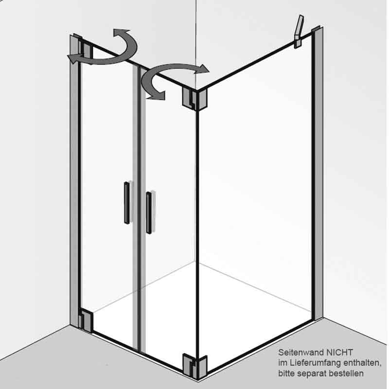 | Bauweise: | 2 pendelbare Drehtüren, nach Innen- und Außen öffnend, 8 mm Einscheiben-Sicherheitsglas (ESG) mit innen glasbündigen Scharnieren & Clipsprofil, Profil als Wandanschluß, zur Kombination mit einer Seitenwand, Montagefreundlich | |||