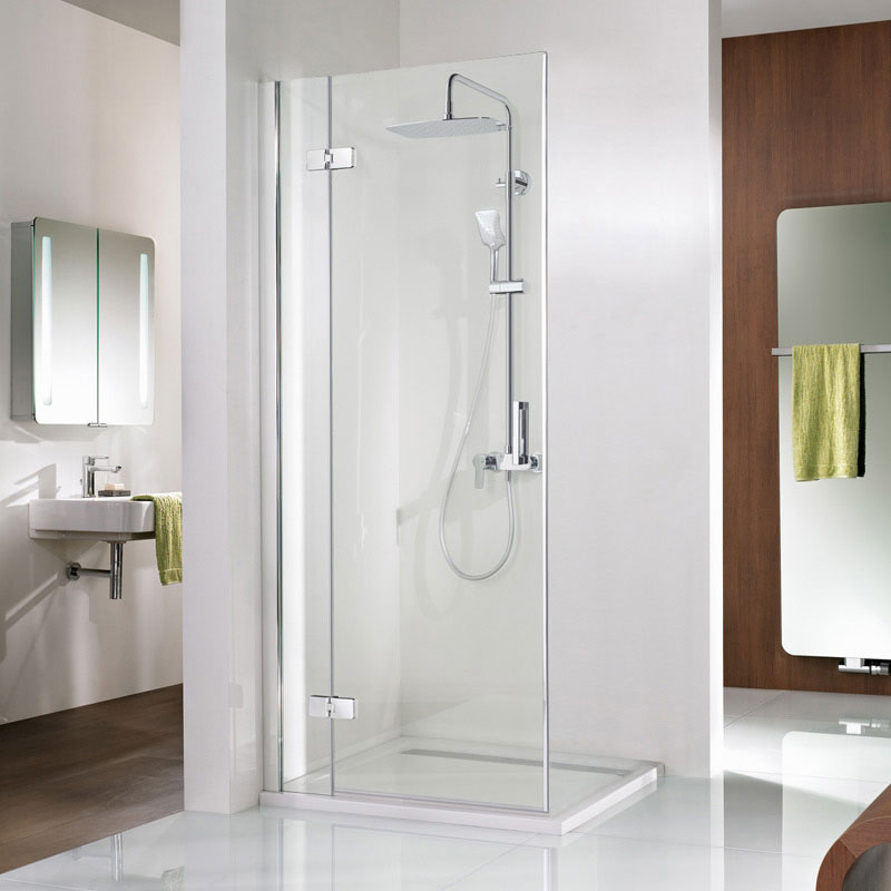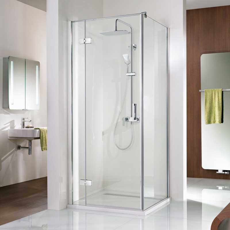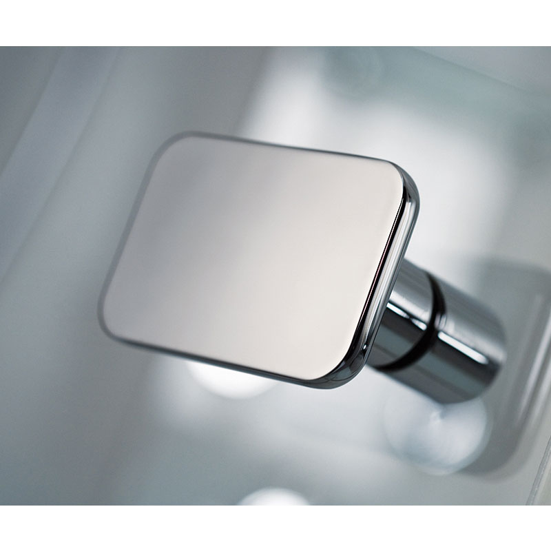 Premium Softcube Drehtür an Nebenteil zur Kombination mit einer Seitenwand, aus 6 mm Einscheiben-Sicherheitsglas (ESG), mit innen glasbündigen Scharnieren und Clipsprofil. Zur Montage auf einer Duschwanne. Dank des Clipsprofils ist die Montage sehr einfach und die Schrauben werden durch das Clipsprofil verdeckt. Flächenbüniger Scharnier mit Heb,- Senkmechanismus. Beim Öffnen werden die Türen angehoben, beim Schließen senken sich diese ab. Der formschöne Griff vermitteln eine angenehme Haptik.