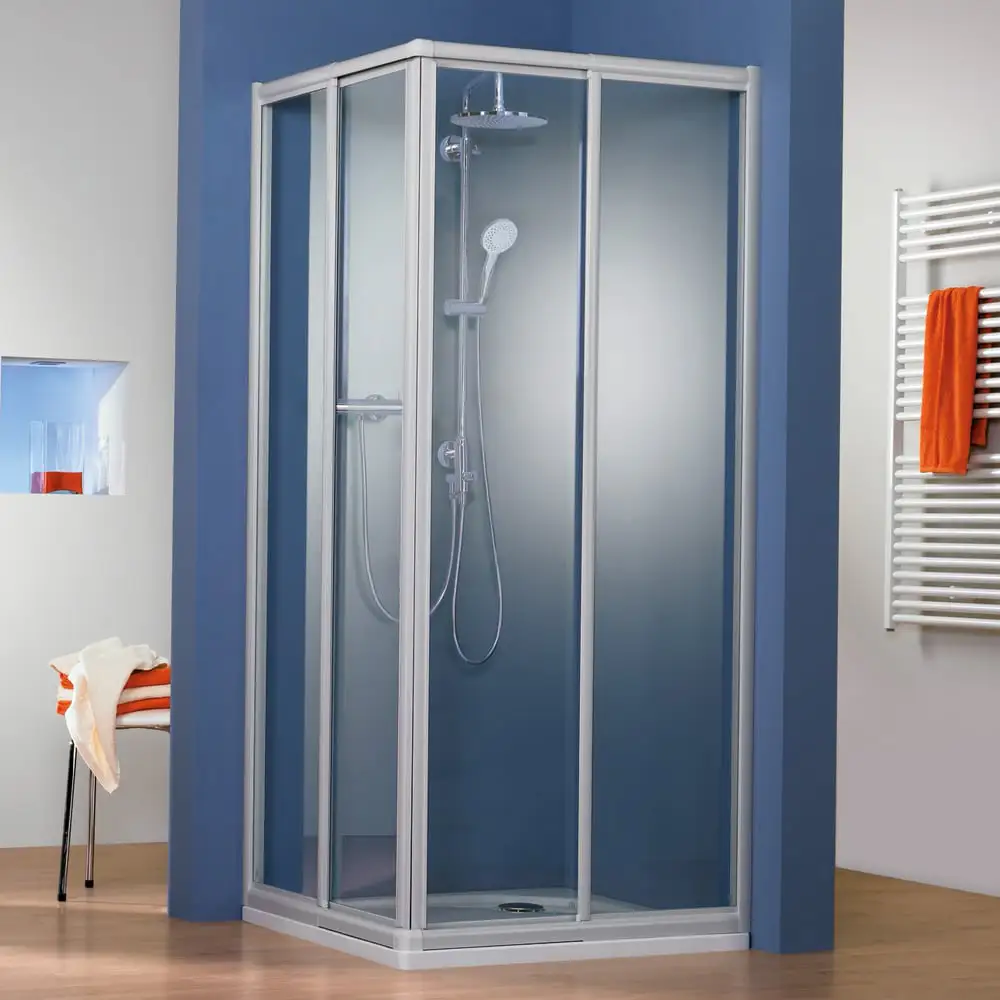 HSK Prima Eckeinstieg mit Schiebetüren, 2-teilig , in gerahmter Bauweise. Die Türen sind zu Reinigungszwecken abklappbar. Ein großzügiger Verstellbereich erlaubt die Passform auf vielen Duschwannen.