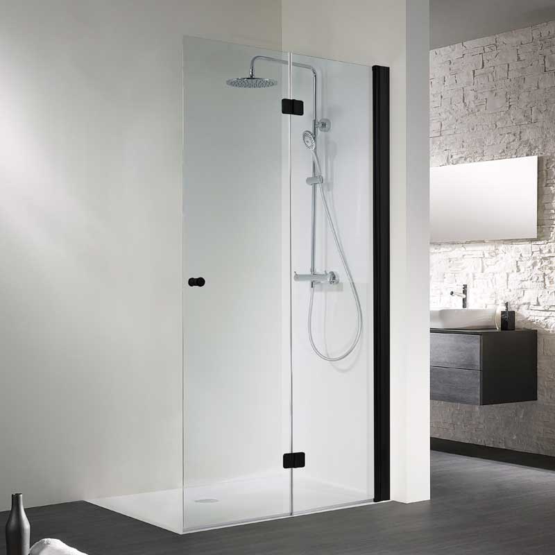 Walk IN Drehfalttür Dusche mit innen glasbündigen Scharnieren und Knaufgriff, vorderes Türelement mit Heb-Senk Scharnier, hinteres Türelement mit Hebe-Senk-Profil, Knaufgriff mit Gummieinlagen, sehr Montagefreundlich