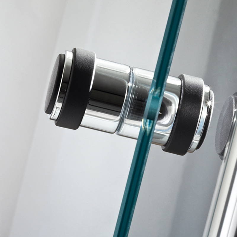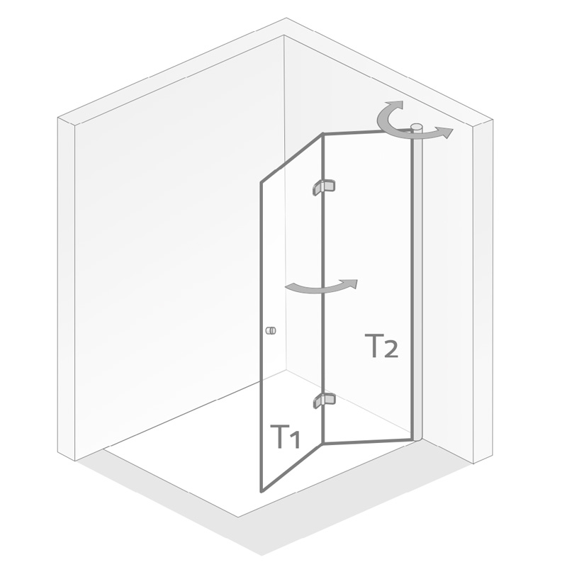 Walk IN Drehfalttür Dusche mit innen glasbündigen Scharnieren und Knaufgriff, vorderes Türelement mit Heb-Senk Scharnier, hinteres Türelement mit Hebe-Senk-Profil, Knaufgriff mit Gummieinlagen, sehr Montagefreundlich