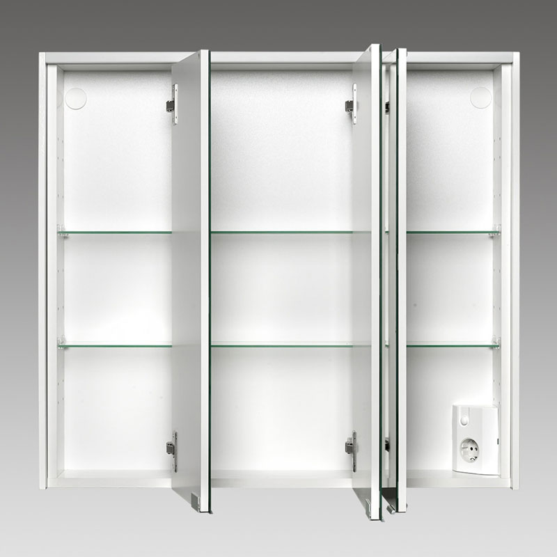 Spiegelschrank aus MDF/Holz mit Dekoroberfläche, Beleuchtung LED-Light Strip, mit Spiegeltüren aus Kristallglas mit Soft-Close, Außen verspiegelt, verstellbare Glasablagen, Schukosteckdose und Schalter