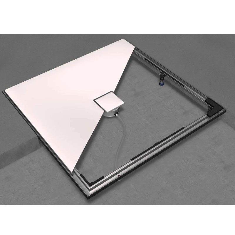 Der stabile Aluminiumrahmen des ESR Bodeneben ist passend zur jeweiligen Größe der Duschfläche in Abmessungen von 75 x 80 Zentimeter bis 100 x 180 Zentimeter vormontiert. Schallschutzband und Fußaufnahmen sind am Rahmen bereits angebracht, sodass die Installation durch den Fachhandwerker noch einfacher und schneller gelingt. Mitgeliefert werden Schalungsplatten für die Estrichaussparungen und Bodenbefestigungen zur Fixierung des Rahmens. Ebenfalls im Lieferumfang enthalten ist eine besondere Ausführung des Kaldewei Dichtsets Bodeneben. Das Dichtband und die vorgeformten Dichtecken werden direkt in den Rahmen geklebt und in die Abdichtung zur Bausubstanz an Boden und Wand integriert. Eine zweite Dichtebene am Rahmenprofil sorgt dafür, dass kein Wasser unter die Duschfläche gelangt. Zwischen den beiden Dichtebenen, im Rahmenprofil, befindet sich der bewährte Kriechwasseranschluss mit Rückflussverhinderer. Er wird an die Ablaufgarnitur angeschlossen und führt eindringendes Kriechwasser sicher ab.