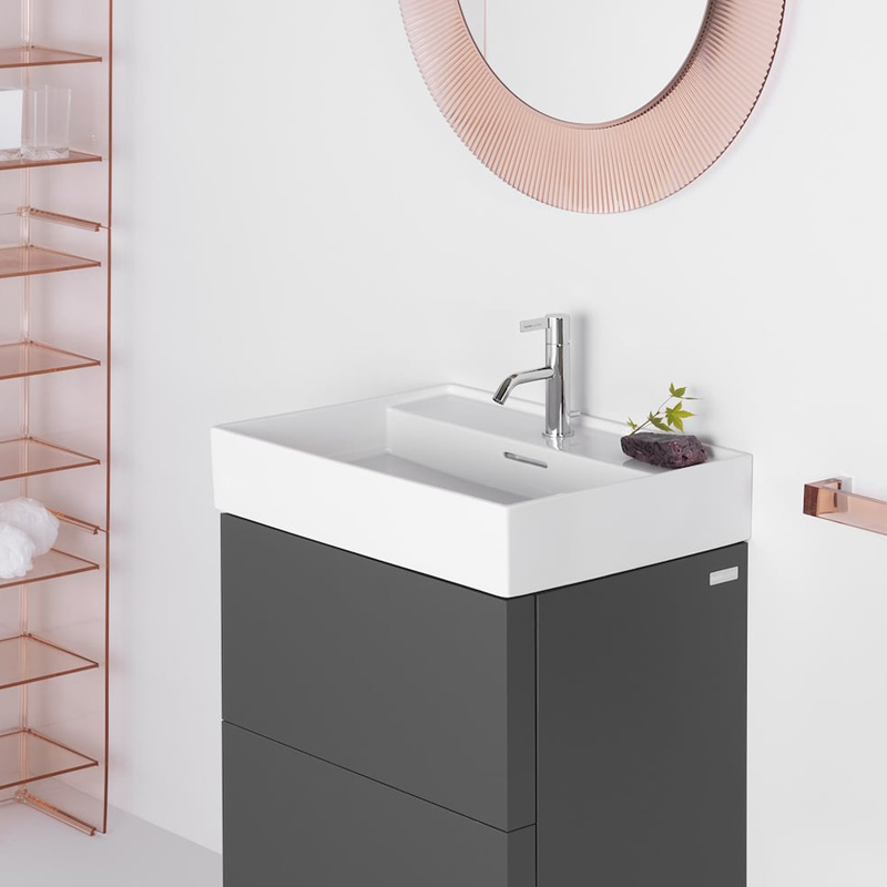 Flexibilität bietet der Laufen Kartell Waschtisch auch bei der Installation: Er ist wahlweise mit oder ohne Hahnlochbohrung erhältlich, sodass Sie die Freiheit haben, Ihre bevorzugte Armatur zu wählen – sei es eine Wandarmatur oder eine Standarmatur direkt auf dem Waschtisch.