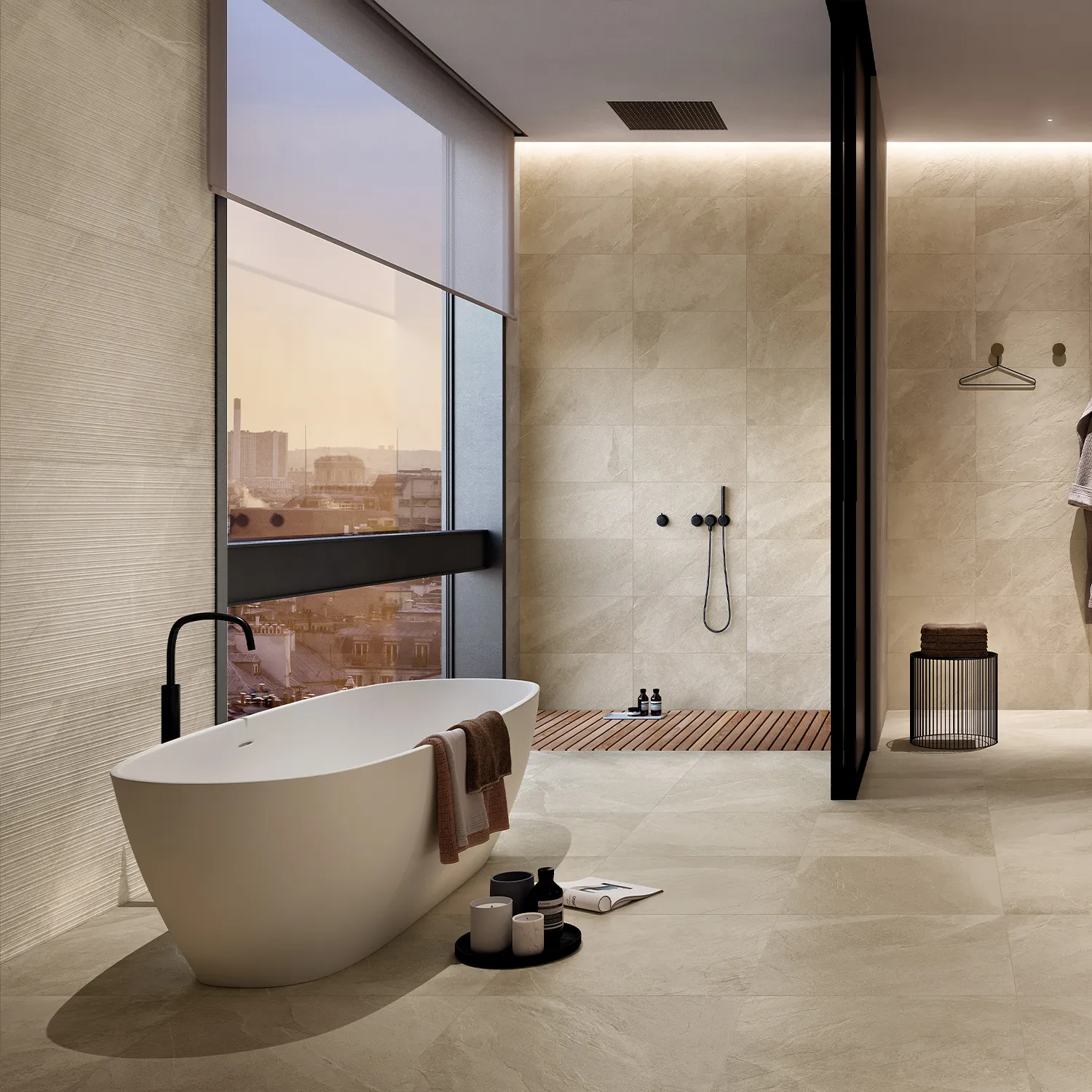 Besonders ausdrucksstark wirkt das aufwendig gestaltete 3D-Relief mit seiner markanten Linienstruktur. Dadurch entsteht ein lebendiges Spiel aus Licht und Schatten, das der Oberfläche mehr Tiefe, Dynamik und Charakter verleiht. Als ergänzendes Dekor zur Shale Fliesen-Kollektion eignet sich Shale Sand Ribbed ideal, um Akzentwände stilvoll hervorzuheben oder Duschbereiche und einzelne Wandflächen mit einer besonderen Optik aufzuwerten. So entstehen individuelle Raumlösungen mit hochwertigem, architektonischem Anspruch.