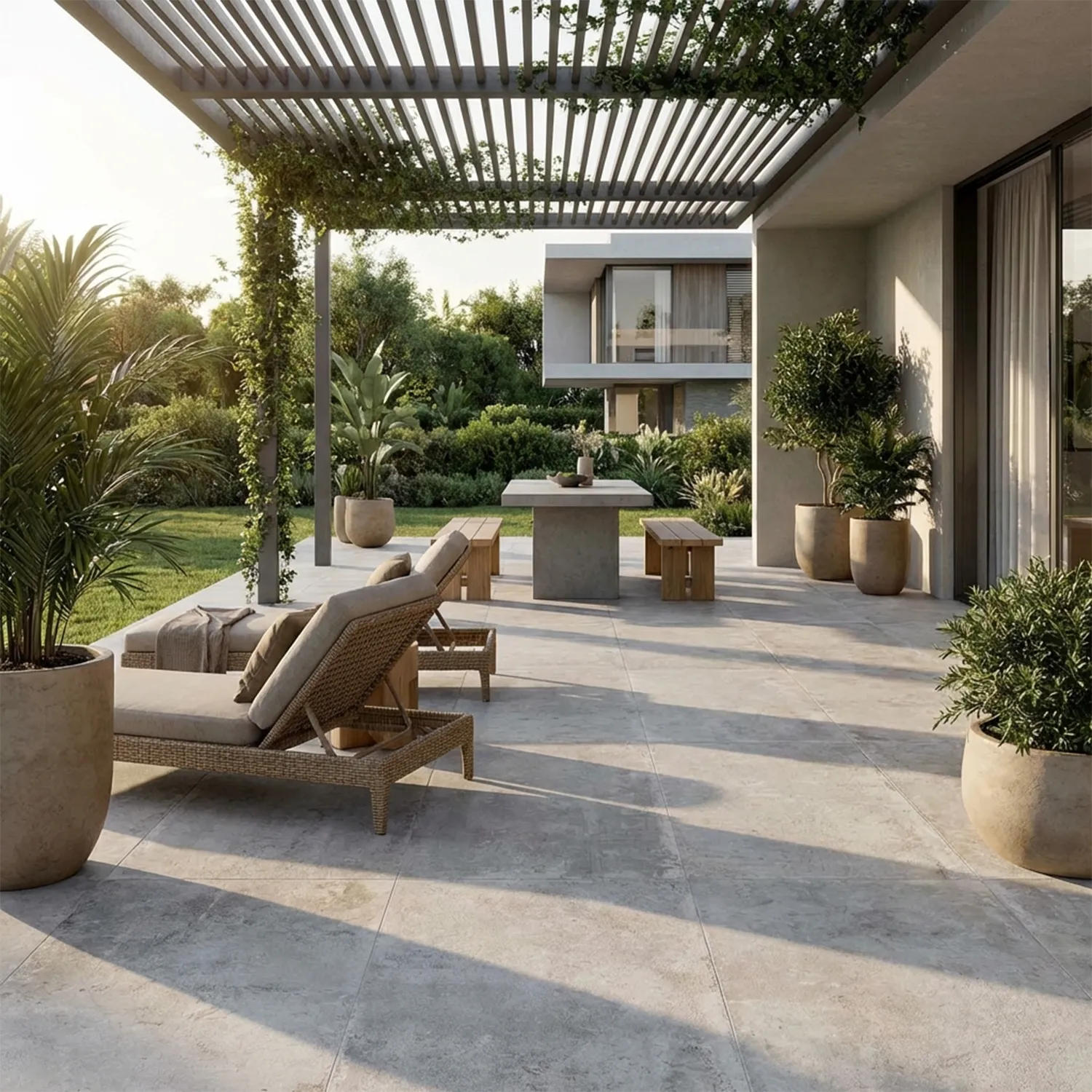 Gefertigt aus hochwertigem Feinsteinzeug, sind diese Platten ideal für den Einsatz im Freien geeignet. Die kalibrierten Kanten sorgen für ein präzises Verlegebild und erleichtern die Installation erheblich. Ob auf einem Splittbett, Stelzlager, Sand oder Rasen – die Vielseitigkeit der Verlegemöglichkeiten macht diese Terrassenplatten zu einer flexiblen Lösung für unterschiedlichste Garten- und Terrassengestaltungen.