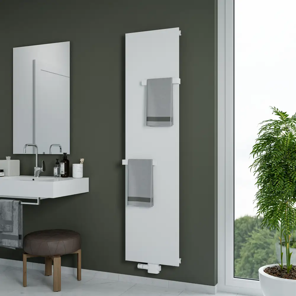 Der Corpotherma Trias -SELECT- Badheizkörper kombiniert modernes Design mit praktischer Funktionalität: Die glatte Front sorgt für eine ruhige, elegante Optik, während der elegante Mittenanschluss (Nabenabstand 50 mm) eine saubere, zentrierte Installation ermöglicht und sich harmonisch in jedes Badambiente einfügt.