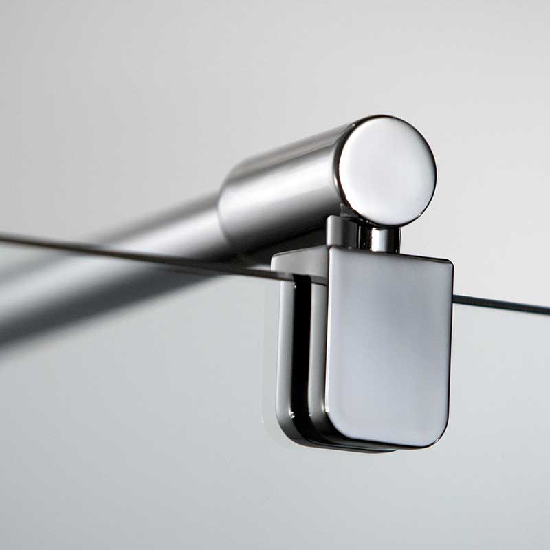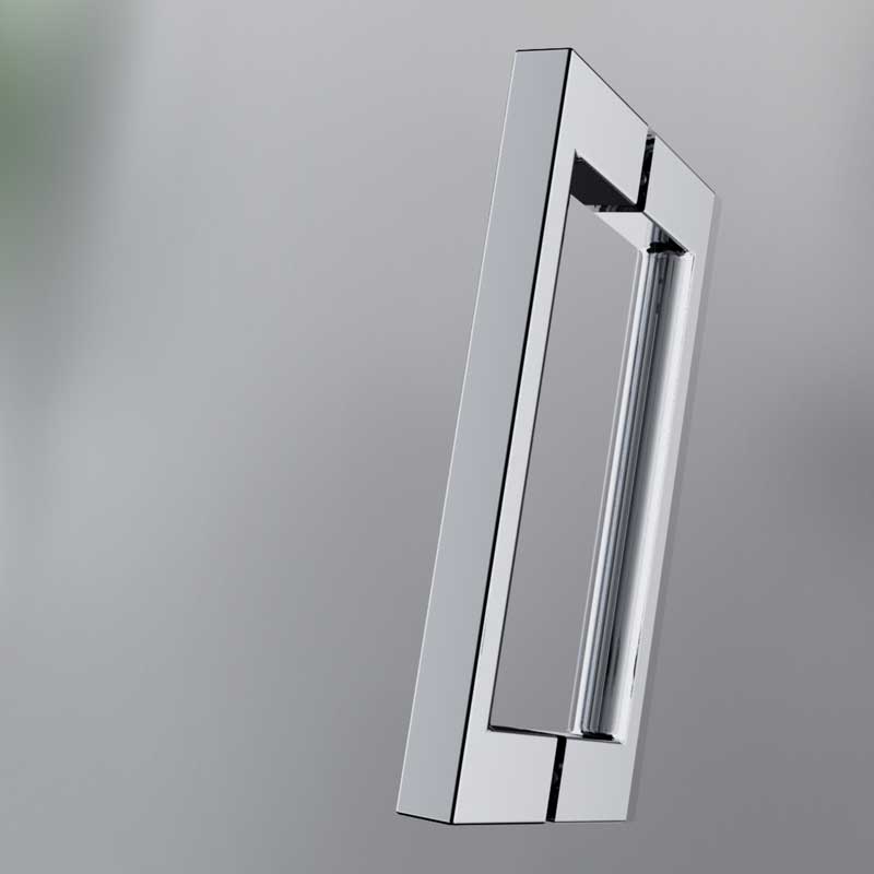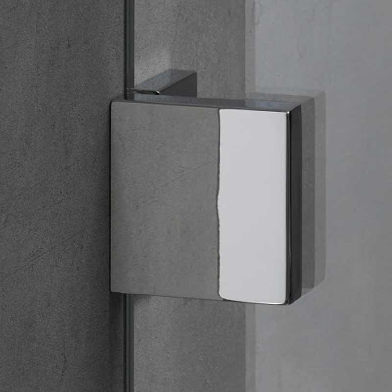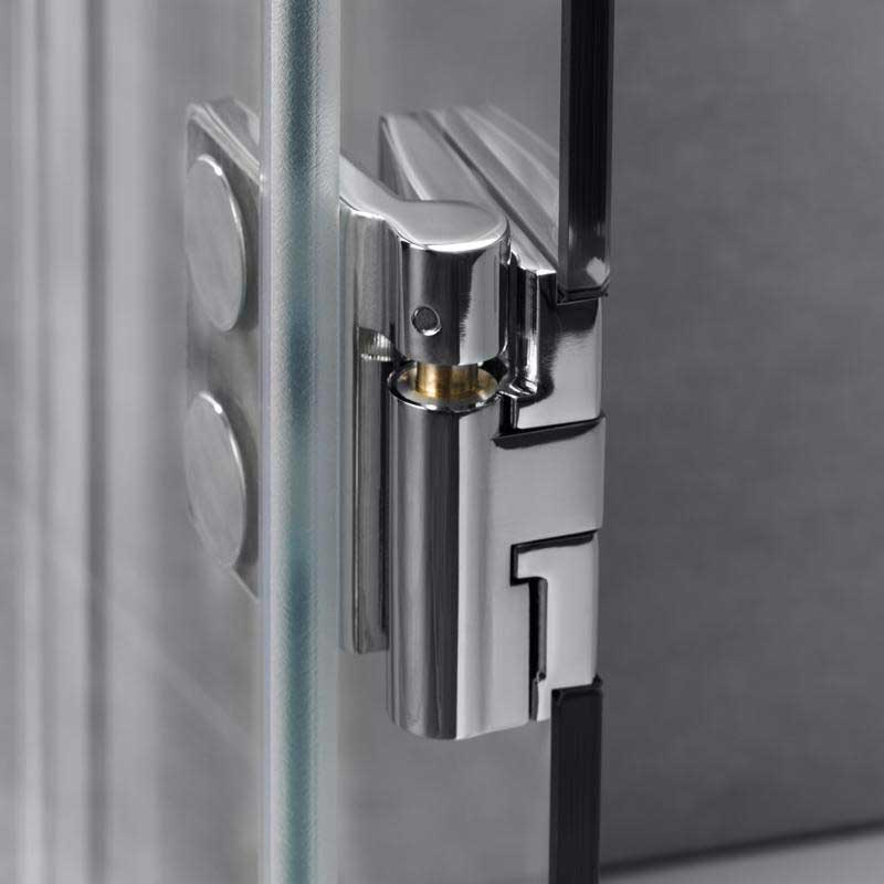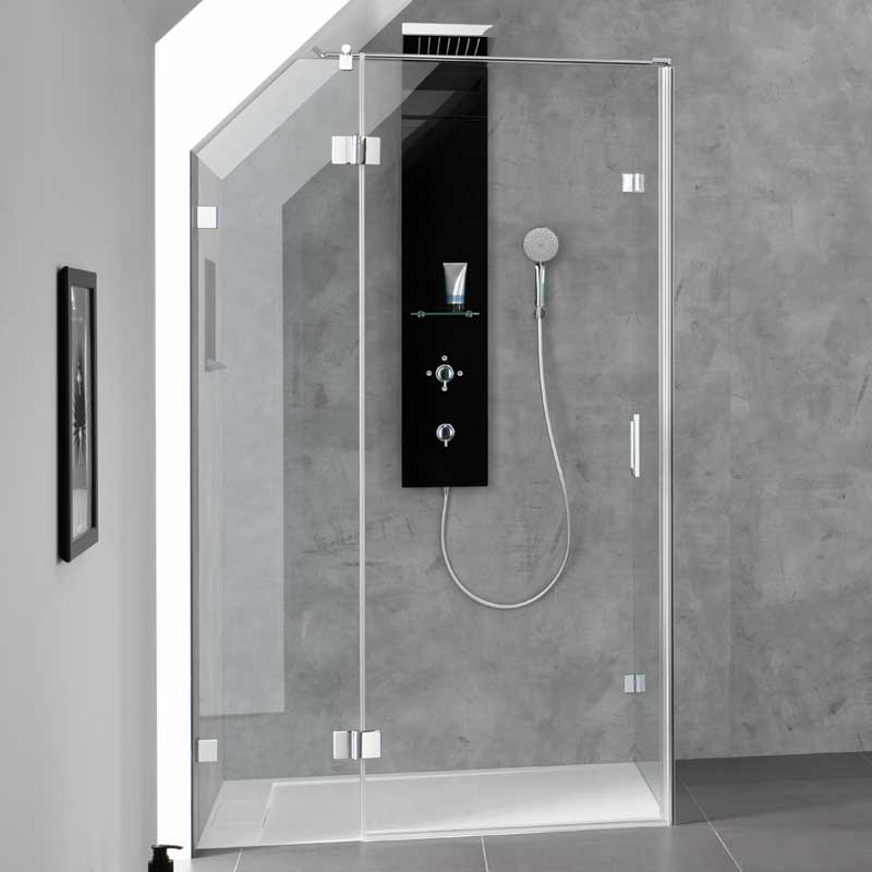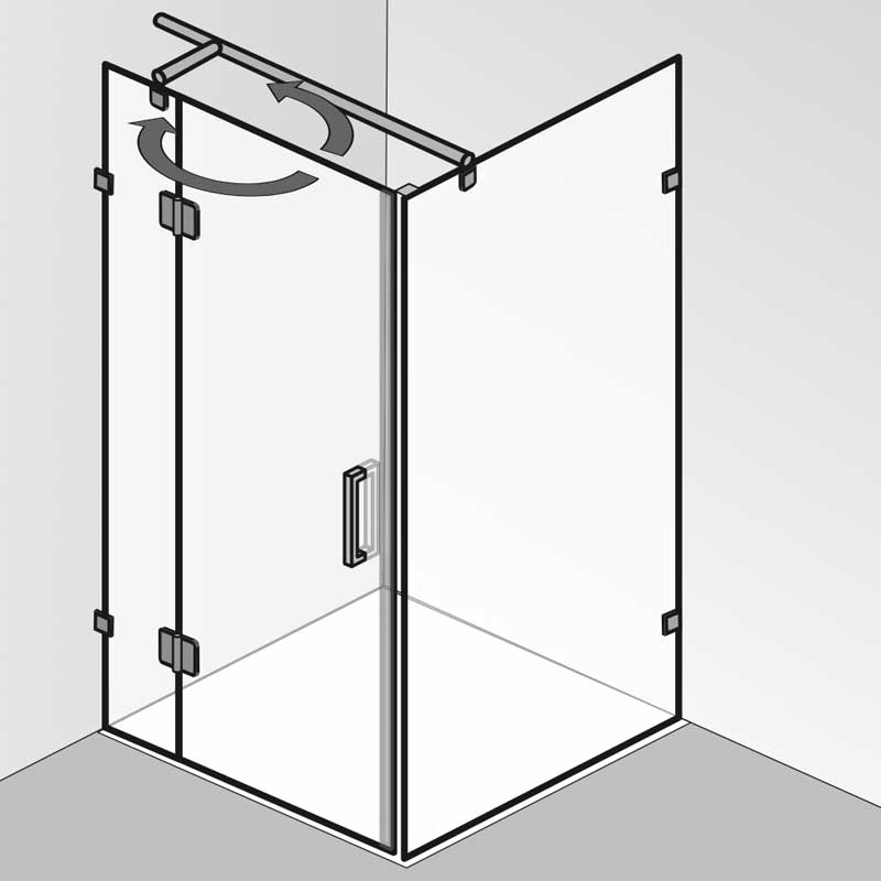 Rahmenlose Drehtür an Nebenteil mit Seitenwand. Festelemente aus 8 mm, Tür Element aus 6 mm Einscheiben-Sicherheitsglas (ESG) mit innen glasbündigen Scharnieren und Wandwinkeln. Austechnischen Gründen kann die Breite des Türteils max. 778 mm betragen. Ab einer Breite (türseitig) ≥ 90,0 cm wird serienmäßig mit Kreuzverstrebung geliefert. Breiten über 130 cm sind gegen Aufpreis auf Anfrage erhältlich.