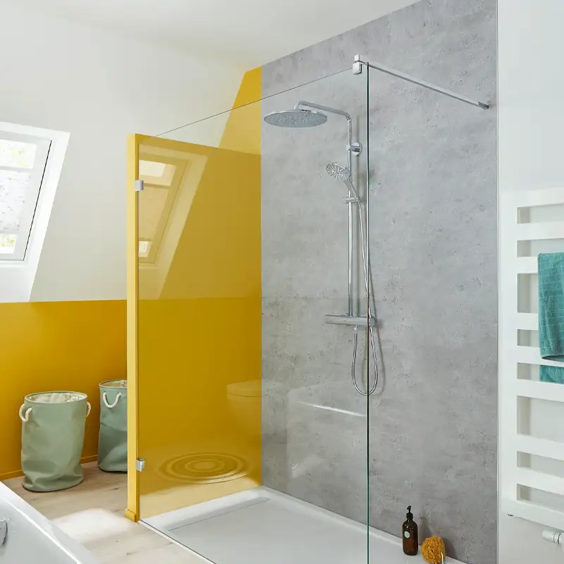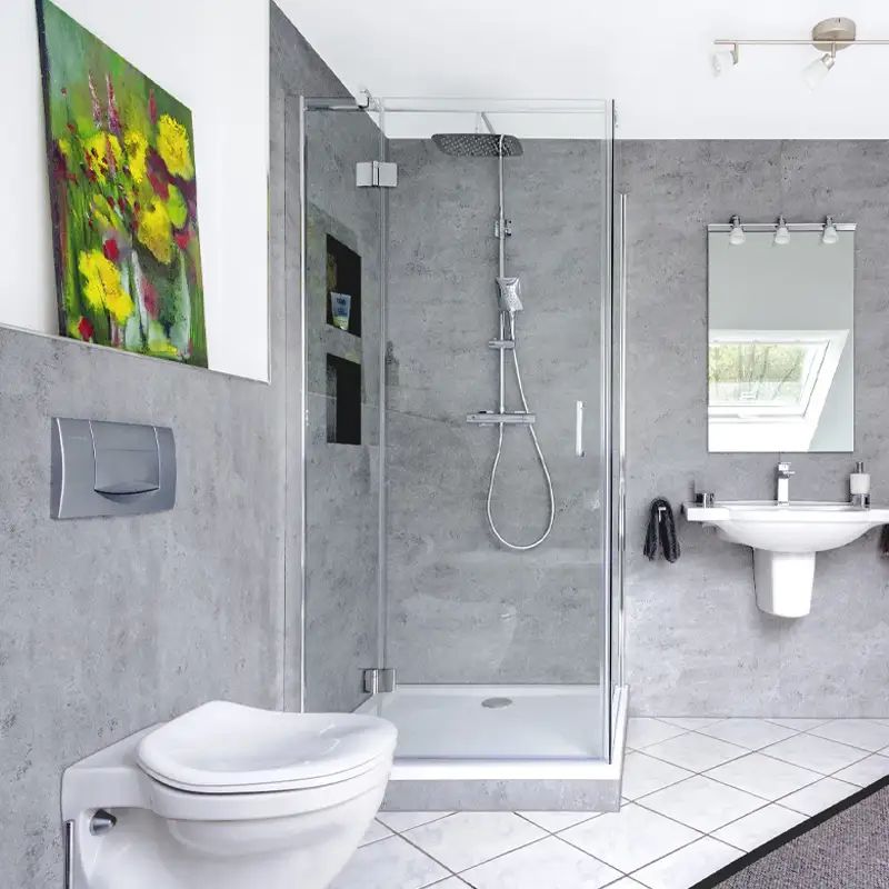 Das RenoDeco Wandverkleidungssystem lässt Bäder und Duschkabinen in neuen, frischen Looks erstrahlen und überzeugt besonders mit seinen hygienischen Eigenschaften. Die hochglänzenden und seidenmatten Aluminium-Verbundplatten sind mit einem Oberflächenlack versiegelt, der für einen Lotus-Effekt sorgt. Die Platten mit Strukturoberfläche verfügen über einen Lack mit Perleffekt.