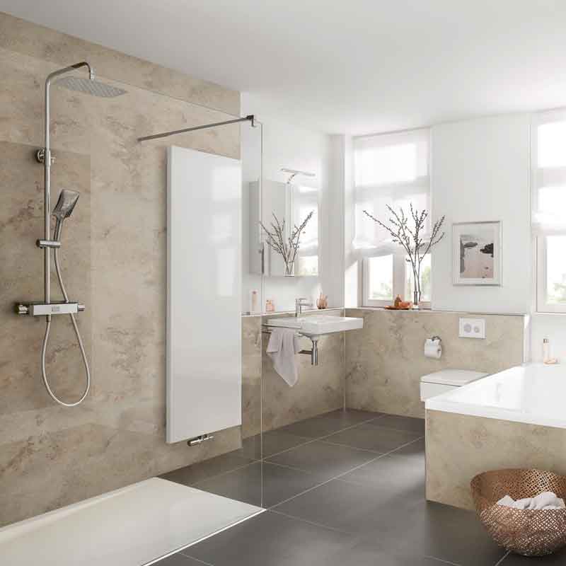 Das RenoDeco Wandverkleidungssystem lässt Bäder und Duschkabinen in neuen, frischen Looks erstrahlen und überzeugt besonders mit seinen hygienischen Eigenschaften. Die hochglänzenden und seidenmatten Aluminium-Verbundplatten sind mit einem Oberflächenlack versiegelt, der für einen Lotus-Effekt sorgt. Die Platten mit Strukturoberfläche verfügen über einen Lack mit Perleffekt.