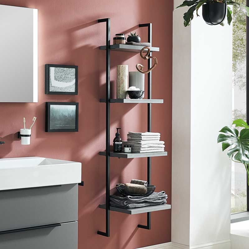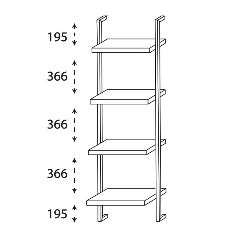System Regal für wandhängende Montage, Breitenvariabel von 300 - 600 mm, Metallgestell in schwarz matt, 4 feste Holzfachböden, Tiefe Böden: 200, 240, 280, 320 mmDieses Regal lassen wir auf Maß für Sie anfertigen.
