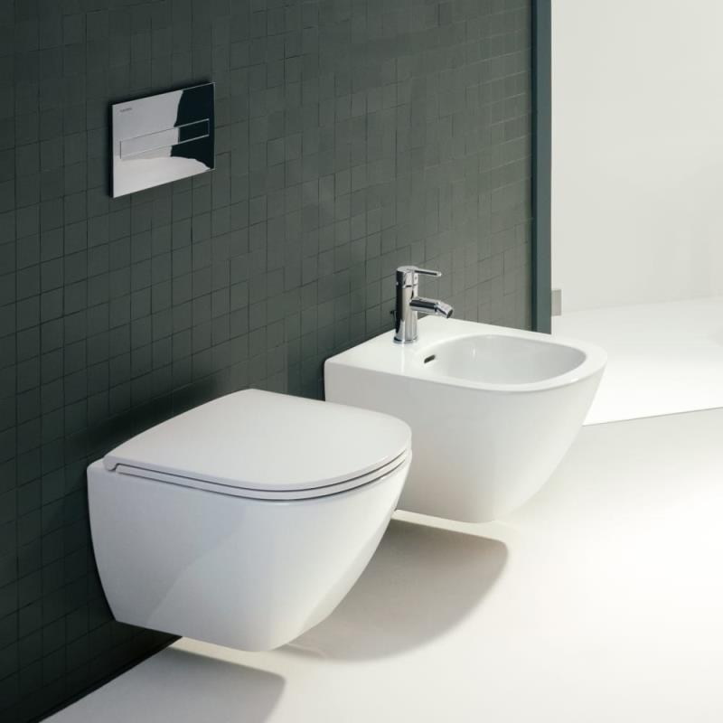 Laufen Lua Bidet, wandhängende Montage, 1 Hahnloch mittig, 2 seitliche Löcher für Wasseranschluss (außenliegend), für 1-Loch-Armaturen geeignet, mit Befestigungssatz (EasyFit)| Hersteller: | Laufen |