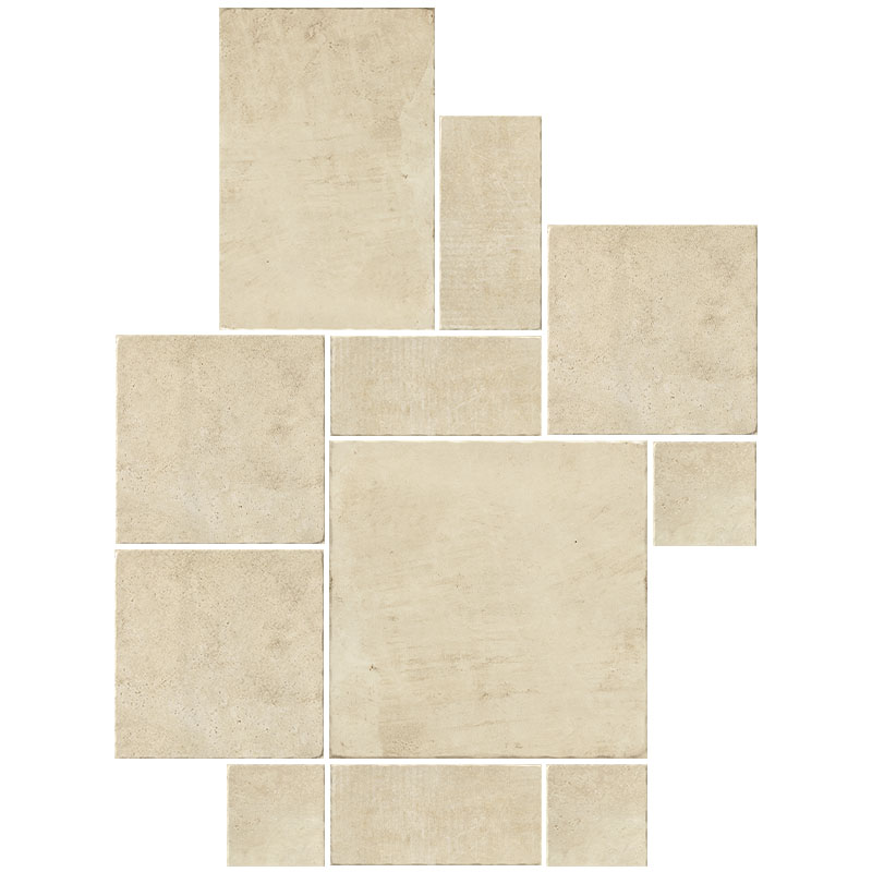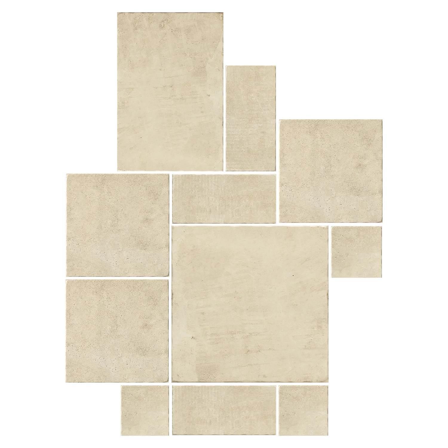 Ein Karton des Bodenfliesen Sets Modulare 43 enthält alle Fliesenformate, die Sie für die Verlegung im Römischen Verband benötigen: 1 Fliese im Format 60,8 x 60,8 cm, 1 Fliese 40 x 60,8 cm, 3 Fliesen 40 x 40 cm, 3 Fliesen 20 x 40 cm und 3 Fliesen 20 x 20 cm. Der Kartoninhalt umfasst insgesamt 1,45 Quadratmeter und ist so zusammengestellt, dass sich eine der zwei gezeigten Verlegevarianten komfortabel und passgenau realisieren lässt. Die unterschiedlichen Formate greifen optisch ineinander und erzeugen ein abwechslungsreiches, natursteinähnliches Verlegebild, das an traditionelle mediterrane Steinböden erinnert.