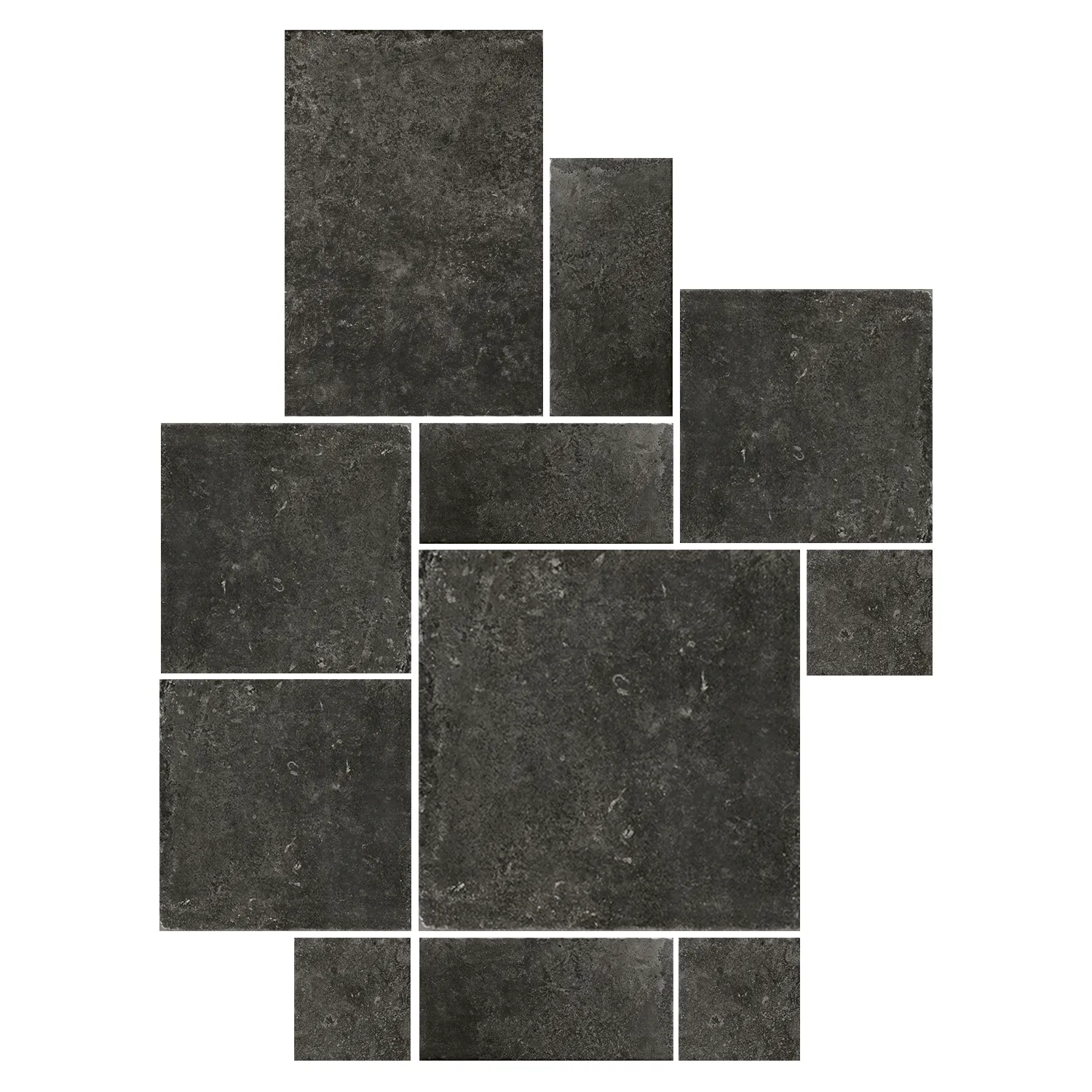 Ein Karton des Bodenfliesen Sets Modulare 43 enthält alle Fliesenformate, die für die Verlegung im Römischen Verband benötigt werden: 1 Fliese im Format 60,8 x 60,8 cm, 1 Fliese 40 x 60,8 cm, 3 Fliesen 40 x 40 cm, 3 Fliesen 20 x 40 cm sowie 3 Fliesen 20 x 20 cm. Mit einem Kartoninhalt von insgesamt 1,45 Quadratmetern ist das Set ideal darauf abgestimmt, eine der zwei gezeigten Verlegevarianten effizient und planungssicher umzusetzen. Die unterschiedlichen Formate greifen harmonisch ineinander und erzeugen ein abwechslungsreiches, dynamisches Verlegemuster, das klassischen Natursteinböden im Römischen Verband nachempfunden ist.
