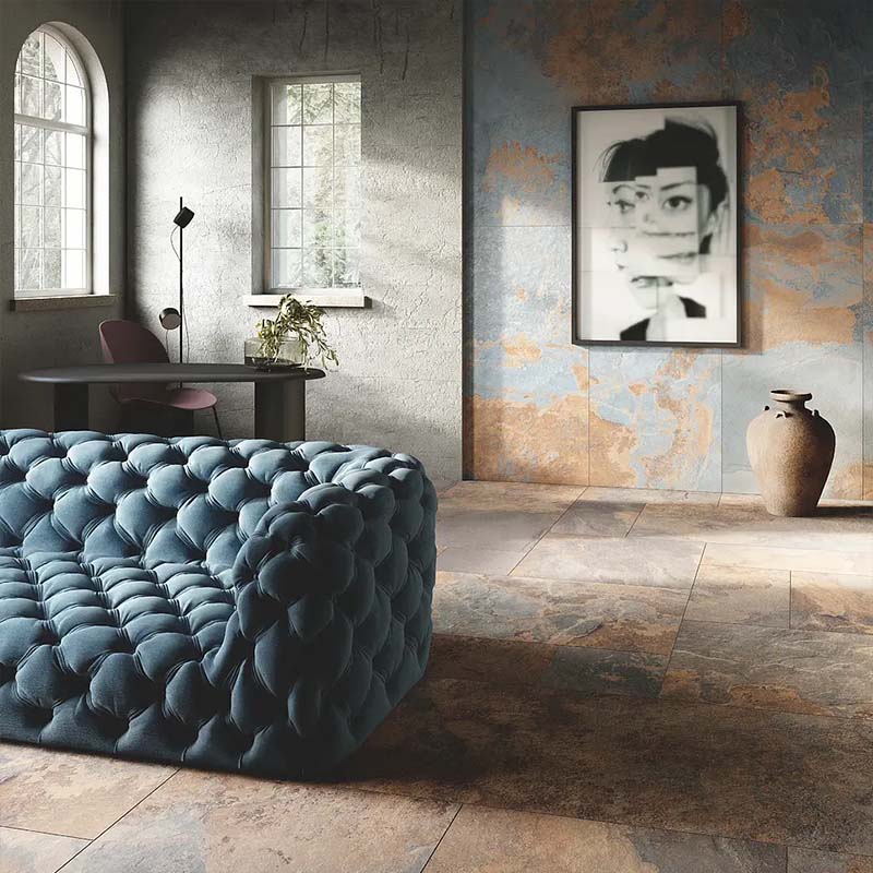 Die kalibrierten Kanten ermöglichen schmale Fugen, was nicht nur optisch ansprechend ist, sondern auch die Verlegung erleichtert. Die authentische Haptik der Oberfläche vermittelt das Gefühl echten Schiefers und bringt eine besondere Atmosphäre in jeden Raum. Der Farbton „River“ ist ein lebendiges Blau-Braun, das die Frische und Ruhe fließender Gewässer symbolisiert. Die tiefen und nuancierten Blautöne erinnern an Bäche, die zwischen Felsen hindurchfließen, und schaffen eine entspannende und besinnliche Atmosphäre – perfekt für Badezimmer, Schwimmbäder oder Ruhebereiche.