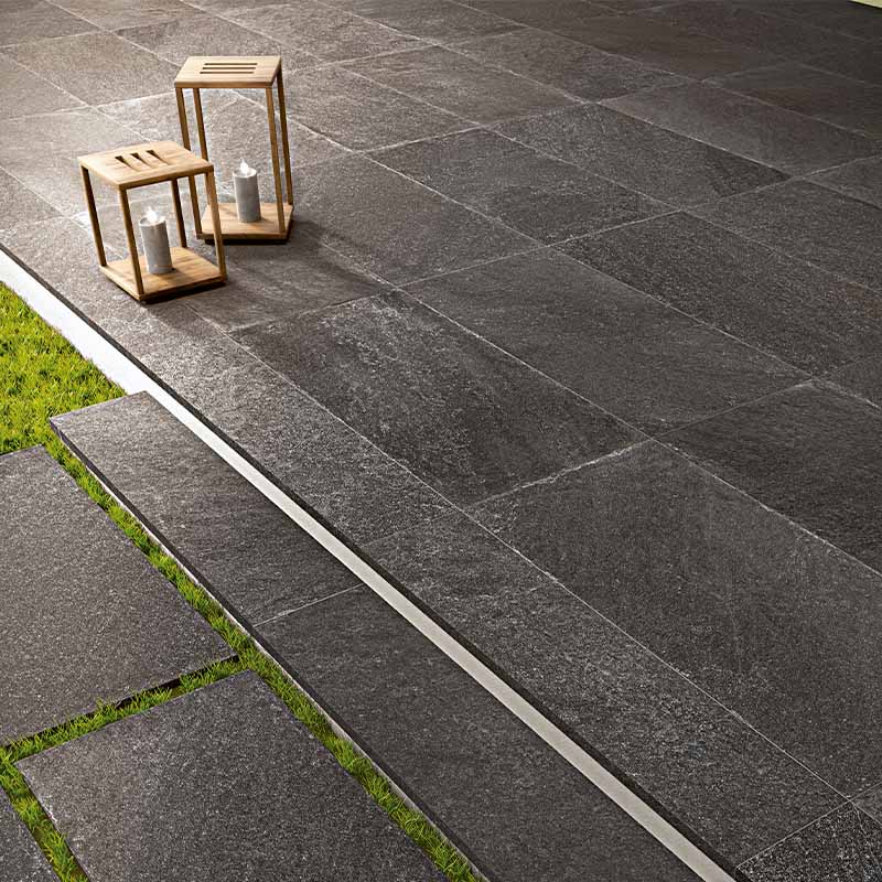 Die Farbe Piombo, ein tiefes Grau, strahlt Ruhe und Beständigkeit aus und lässt sich hervorragend mit verschiedenen Materialien und Farben kombinieren. Verleihen Sie Ihrem Außenbereich mit der Quarzite Piombo Feinsteinzeug Bodenfliese eine exklusive Note – robust, witterungsbeständig und perfekt für stilvolle Outdoor-Gestaltungen.