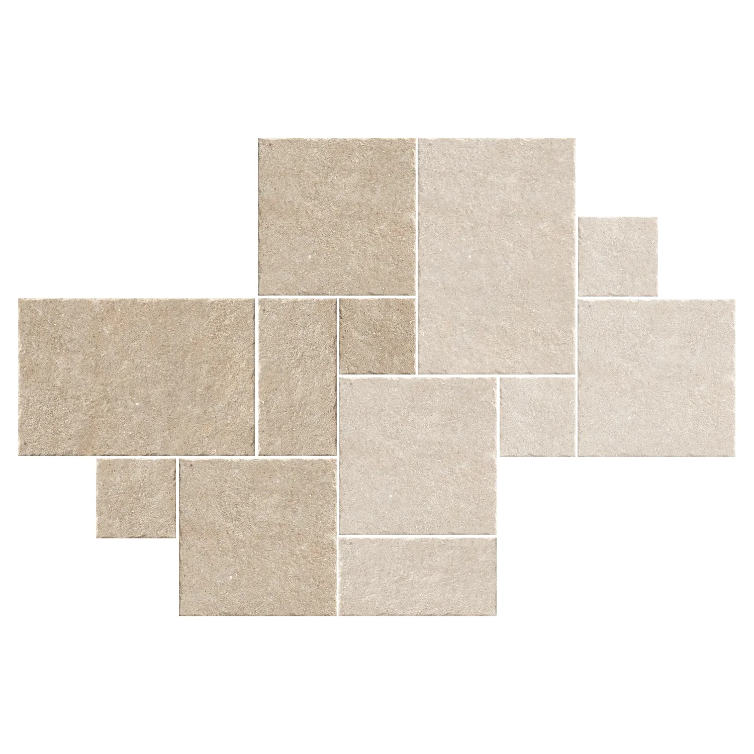 Als Modulbelag für die Verlegung im römischen Verband ist dieses Set ideal, wenn Sie ein lebendiges Verlegebild mit mehreren Formaten wünschen. Ein Karton enthält die perfekt abgestimmten Fliesenformate: 40,6 x 60,9 cm = 1 Stück, 40,6 x 40,6 cm = 2 Stück, 20,3 x 40,6 cm = 1 Stück und 20,3 x 20,3 cm = 2 Stück. Damit gelingt das typische, abwechslungsreiche Muster ohne aufwendige Zusammenstellung einzelner Größen. Passend dazu ist das Set für die gezeigten Verlegemuster geeignet, die Verlegeschemen stehen als Download weiter unten auf der Seite bereit und erleichtern Planung sowie Umsetzung.