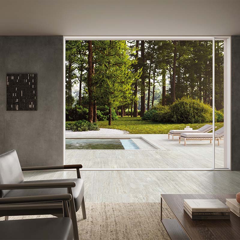 Perfekt abgestimmt auf die Indoor-Kollektion I Travertini von Italgraniti entsteht ein durchgängiges Design von innen nach außen. I Travertini Grigio Vein Cut vereint zeitlose Ästhetik, moderne Performance und eine hochwertige Travertin-Optik für anspruchsvolle Außenflächen.