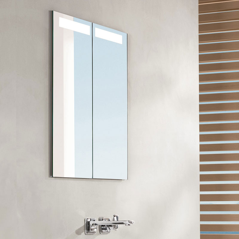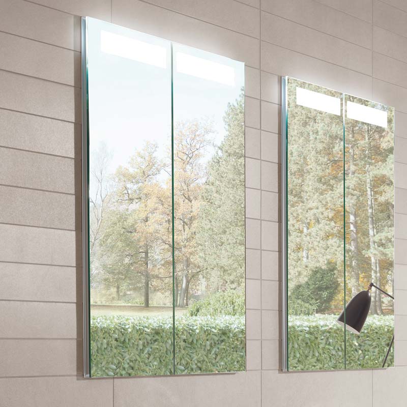 Der My View-In Einbau-Spiegelschrank mit Beleuchtung ist die perfekte Wahl für ein modernes und funktionales Badezimmerdesign. Erhältlich in den Breiten 600, 800 und 1000 mm, bietet dieser elegante Spiegelschrank mit einer Höhe von 747 mm und einer Tiefe von 107 mm eine platzsparende Lösung, die sich nahtlos in Ihre Wand integrieren lässt. Die zweiflügelige Doppelspiegeltür aus hochwertigem Spiegelglas sorgt für ein stilvolles Erscheinungsbild und optimale Sichtverhältnisse.