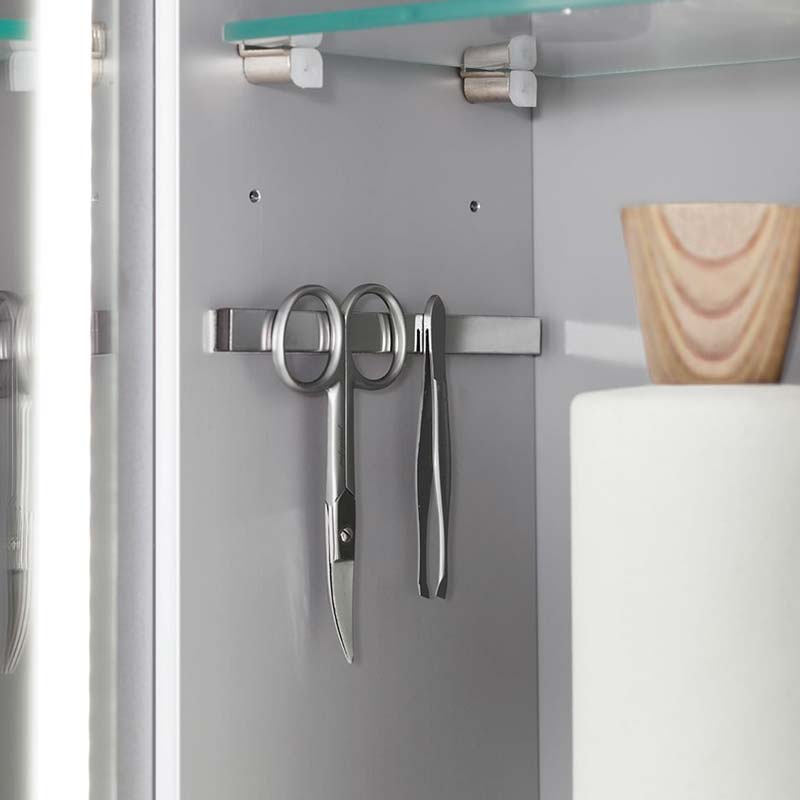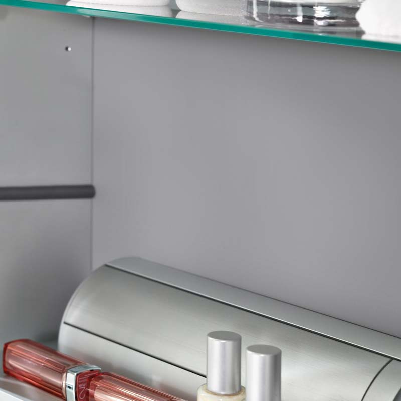 Im Inneren des Schranks finden Sie vier Glasfachböden, die ausreichend Stauraum für Ihre Pflegeprodukte bieten. Ein praktischer Vergrößerungsspiegel erleichtert präzise Pflegearbeiten, während eine Magnetleiste dafür sorgt, dass kleine Metallgegenstände stets griffbereit sind. Der Korpus des Schranks besticht durch seine Innenfarbe in Aluminium silbermatt eloxiert, was dem Schrank eine moderne und edle Optik verleiht.