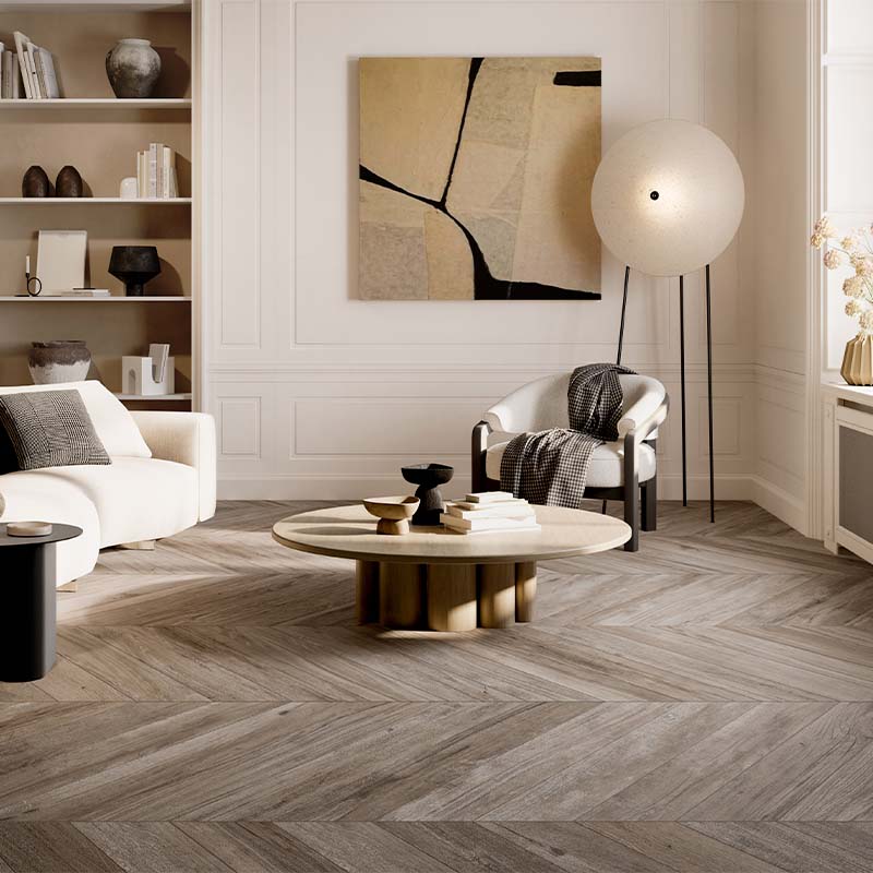 Als strapazierfähiges Feinsteinzeug ist Chevron XL robust, formstabil und pflegeleicht – ideal für langlebige, raffinierte Böden, die im Alltag bestehen und über Jahre ihr Erscheinungsbild bewahren. Soft Ash vereint Funktionalität und zeitloses Design zu einem Boden, der dezent zurücktritt und zugleich die Architektur des Raumes mit klarer Linie und moderner Präzision unterstreicht.