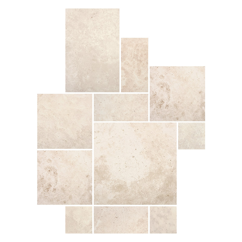 Der Artikel CIR In Falda Travertino Navona Modulare 41 Römischer Verband ist für den gezeigten Modulbelag geeignet, ein Karton enthält die folgenden Fliesenformate: 20 x 20 cm = 3 Stück, 20 x 40 cm = 3 Stück, 40 x 40 cm = 3 Stück, 40 x 60,8 cm = 1 Stück, 60,8 x 60,8 cm = 1 Stück. Kartoninhalt gesamt = 1,452 qm, die Modulverlegung wird mit einer Mindestfuge von 4-5 mm empfohlen.