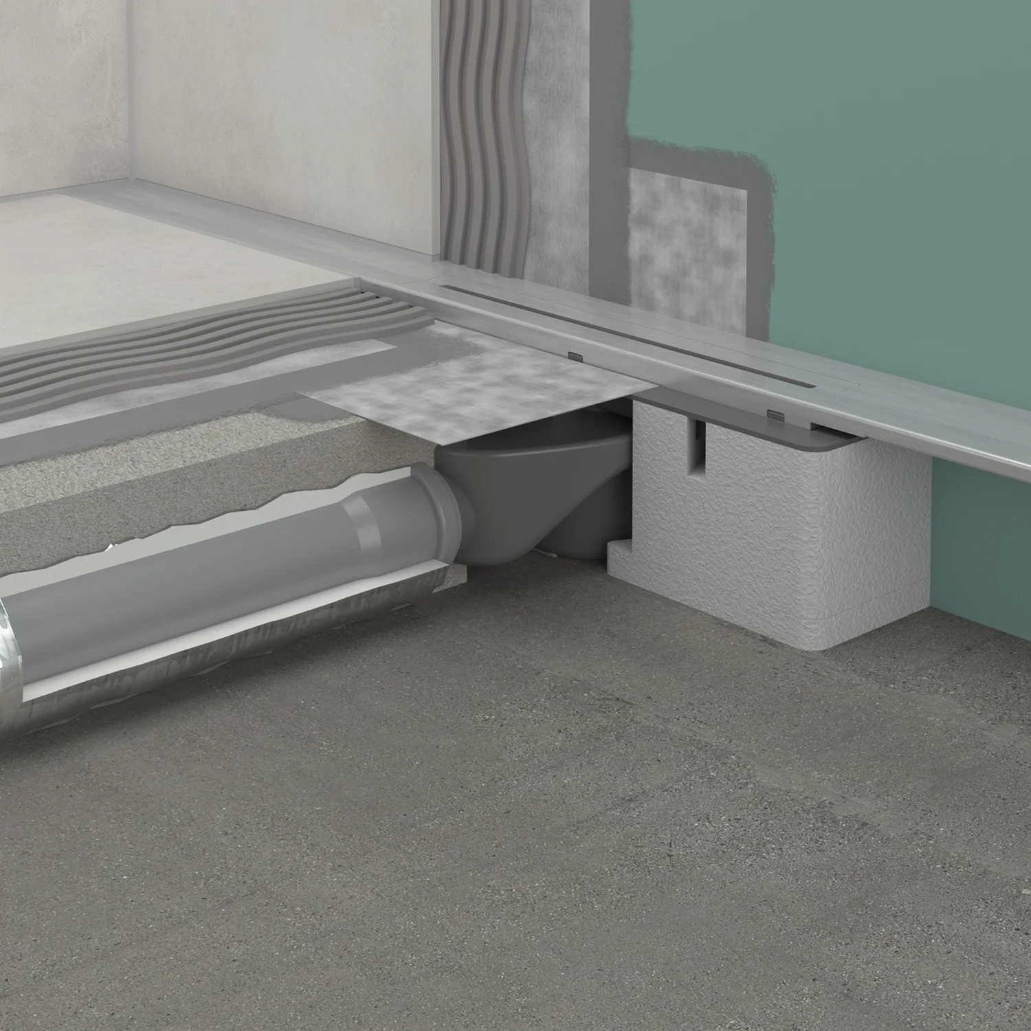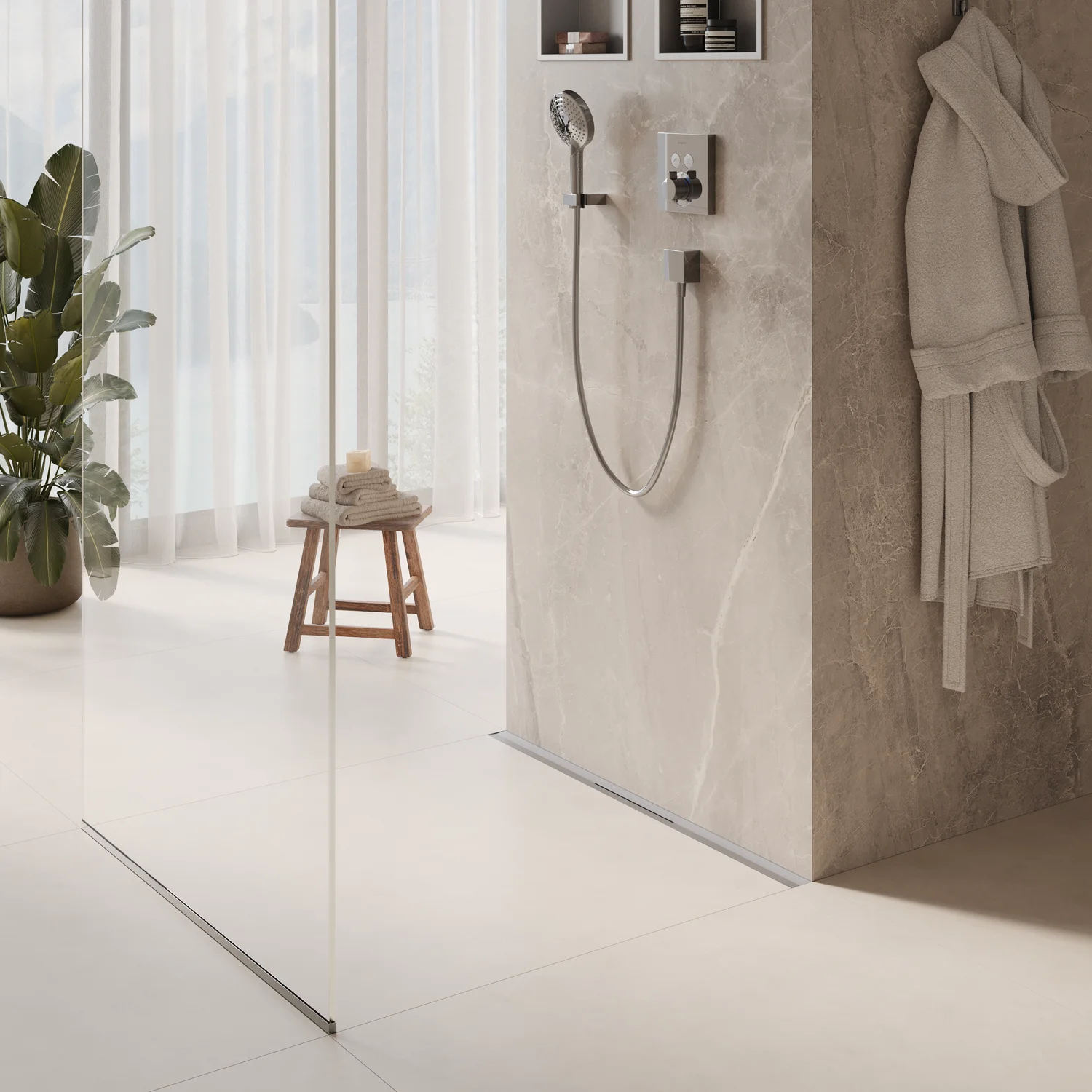 Diese Duschrinne zur wandnahen Montage wird direkt vor der Wand installiert und ermöglicht ein einseitiges Gefälle der Duschfläche. Dadurch eignet sie sich ideal für den Einsatz von großen Fliesenformaten. Je nach Größe von Dusche und Fliese lassen sich so – mit reduziertem Fugenanteil bis hin zu nahezu fugenlosen Duschböden – besonders ruhige und moderne Bodenflächen realisieren.