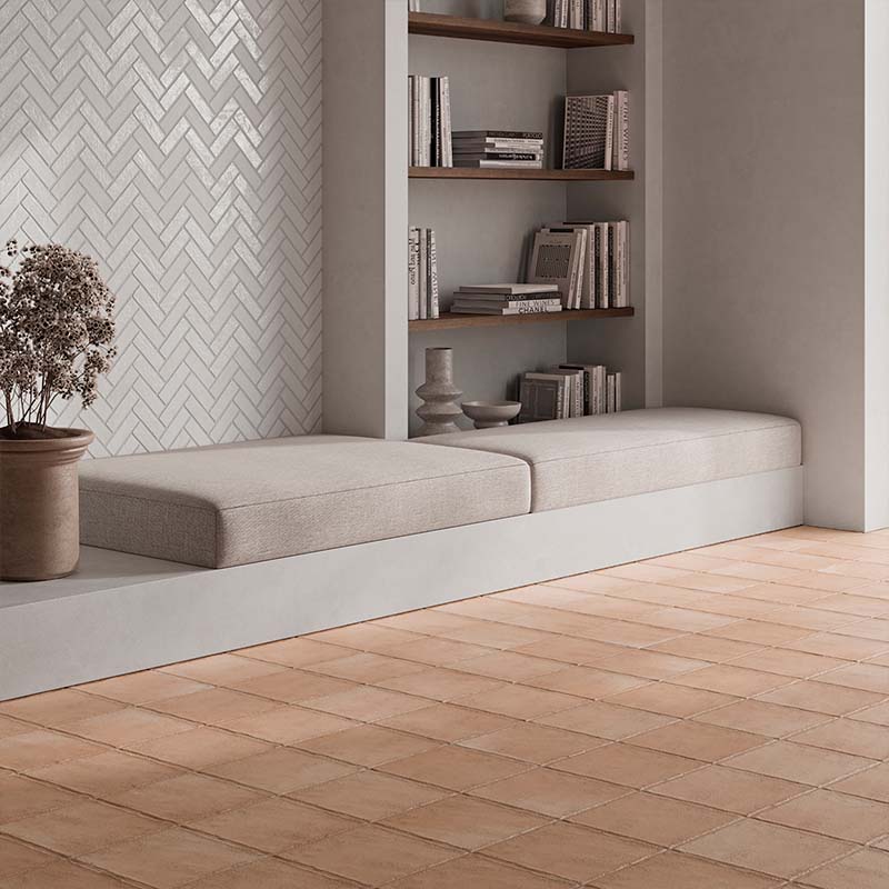 Für maximale Gestaltungsfreiheit ist das Modul für Wand und Boden geeignet. So ziehen Sie einen harmonischen Look vom Eingangsbereich über den Wohnraum bis ins Bad – einheitlich, hochwertig und stilsicher. Das Wechselspiel aus matten und glänzenden Partien unterstreicht Details und lässt das klassische Fischgrät-Muster modern und lebendig erscheinen.