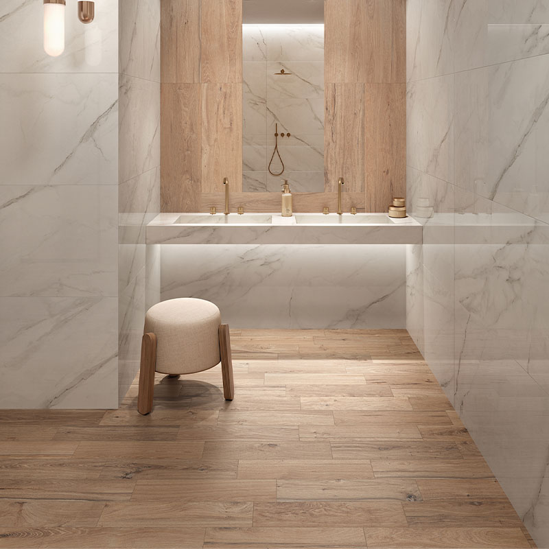 Feinsteinzeug und kunstvolle Dekorfliesen in Holzoptik