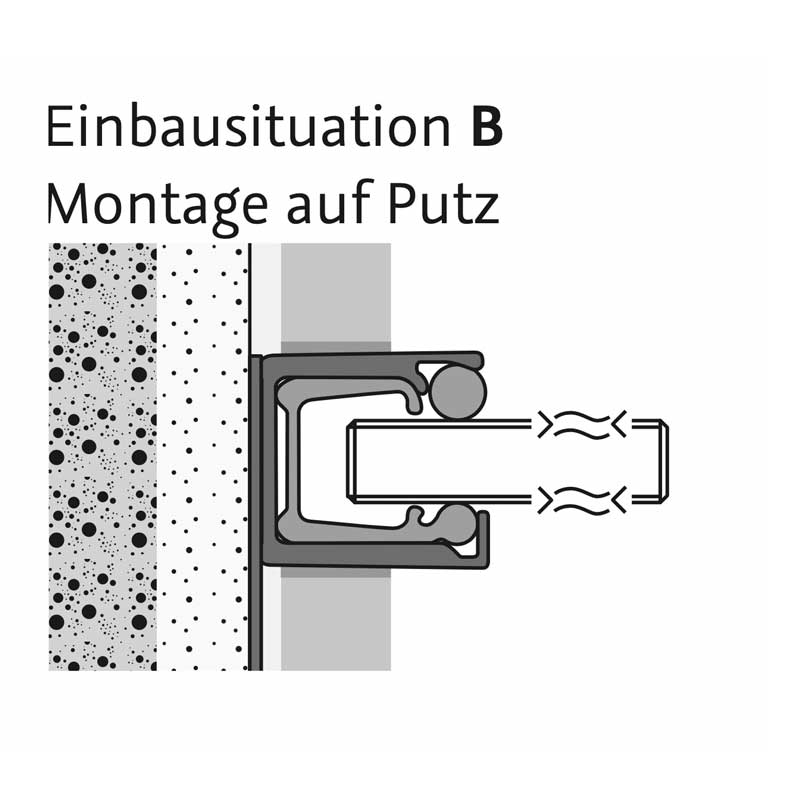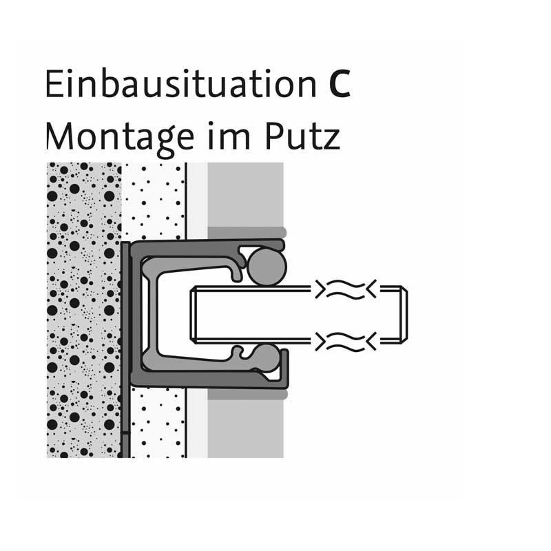 Für den Einbau auf dem Putz oder im Putz wird die Einputzschiene als Ergänzung zum Wandanschlussprofil benötigt. Bitte separat bestellen