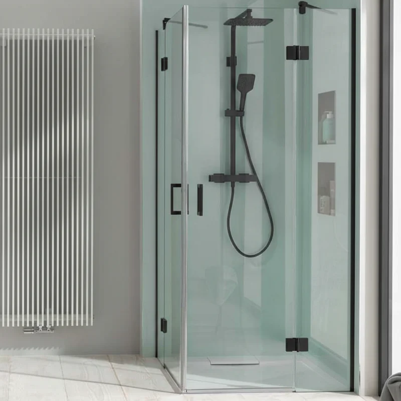 Der HSK Aperto Pro Eckeinstieg pendelbar 4 teilig ist eine Lösung für schwierige Raumsituationen. Trotz hervorstehender Gegenstände, wie Heizkörper, ermöglichen die Festelemente das weite Öffnen der Duschtüren.