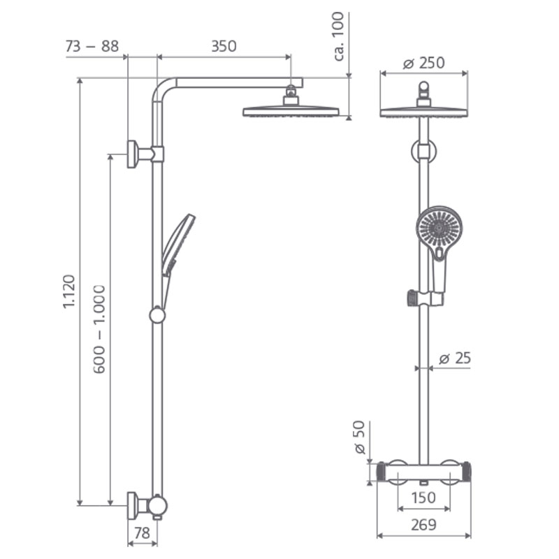| Lieferumfang: | Duschsystem mit Brause-Aufputz-Thermostat, Kopfbrause, Handbrause und Brauseschlauch, Montagezubehör, Montageanleitung |