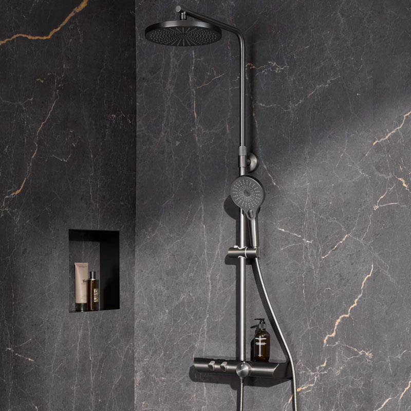 Das neue Shower-Set AquaXPro 200 Thermostat in Gunmetal gebürstet, kombiniert mit schickem schwarz, ist ab sofort das neue "must-have" im Bad.