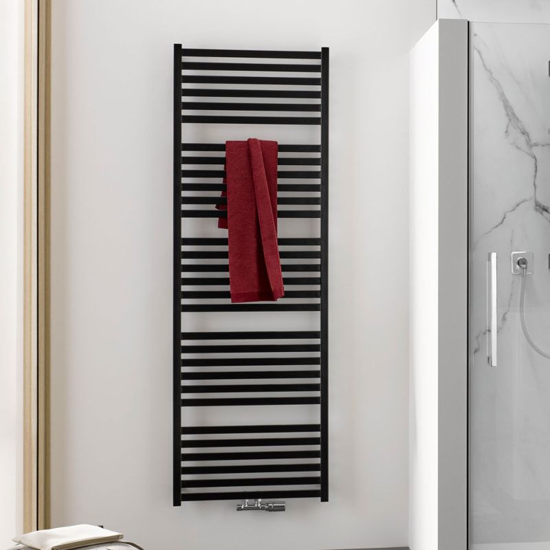 Mit der Entscheidung für den HSK Line Aero Badheizkörper bleibt die Flexibilität der Heizungsart erhalten. Der Designheizkörper im schlanken, markant eckigen Röhrenformat kann für verschiedene Heizungsarten verwendet werden. Gerade bei nachträglichen Veränderungen der Immobilie zeigen sich die Vorteile dieser mehrfachen Verwendungsmöglichkeit. Wird nur ein Teil des Objekts im Warmwasserbetrieb genutzt und kommen weitere Betriebsarten wie Elektroheizkörper oder Mischbetrieb zum Einsatz, schafft der HSK Line Aero Badheizkörper ein einheitliches Erscheinungsbild in der Badezimmergestaltung.Der HSK Line Aero Badheizkörper ist ein klassischer Badheizkörper und Handtuchtrockner, der durch seine eckigen Heizrohre mit der klaren Formgebung moderner Badezimmergestaltung ideal harmoniert. Die Heizrohre sind in Gruppen angeordnet. Durch diese Aufteilung ergeben sich Freiräume, die viel Platz für Badetücher und Handtücher schaffen. Zugleich lockern diese Segmente das dichte Sprossendesign des 6,8 cm bis 7,8 cm tiefen Heizkörpers optisch auf und geben den Blick auf die individuelle Wandgestaltung frei.