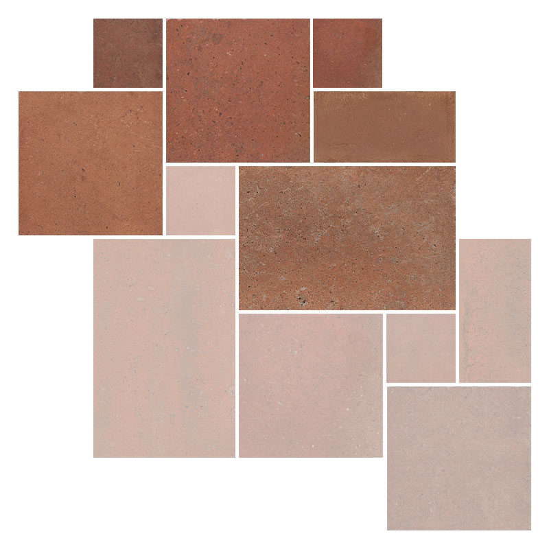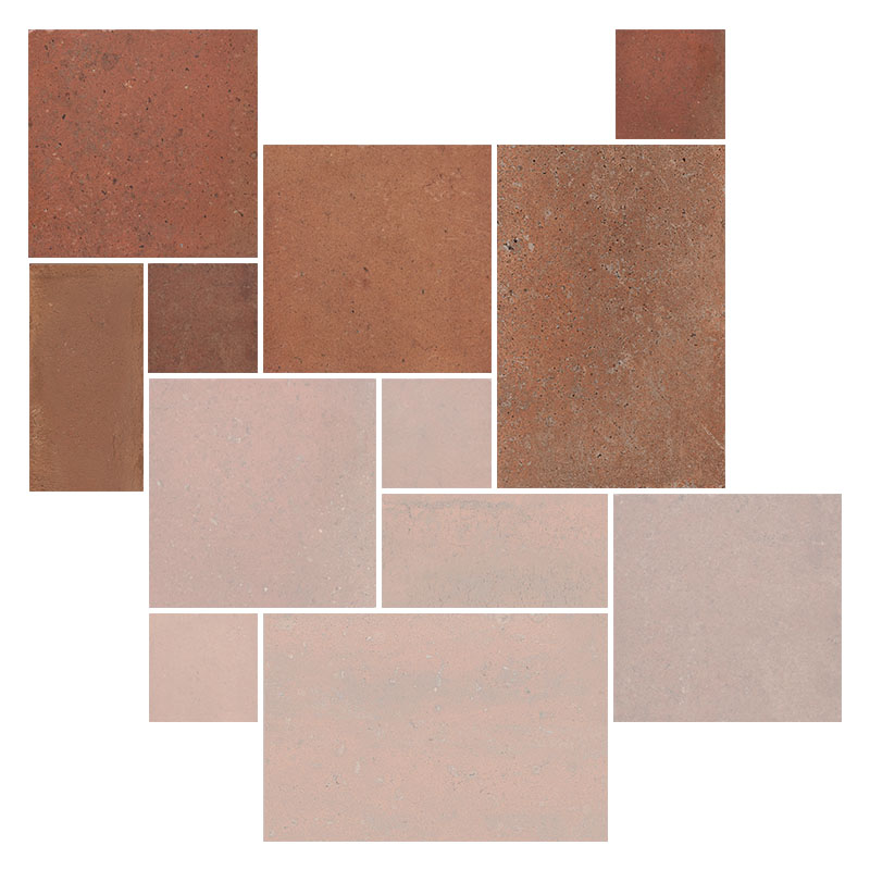 Der Artikel Römischer Verband CIR Italica Terra Bruciata Mod 39 ist für den gezeigten Modulbelag geeignet, ein Karton enthält die folgenden Fliesenformate: 20 x 40 cm = 1 Stück, 40 x 40 cm = 2 Stück, 20 x 20 cm = 2 Stück, 40 x 60,8 cm = 1 Stück. Kartoninhalt gesamt = 0,723 qm, die Modulverlegung wird mit einer Mindestfuge von 4-5 mm empfohlen.
