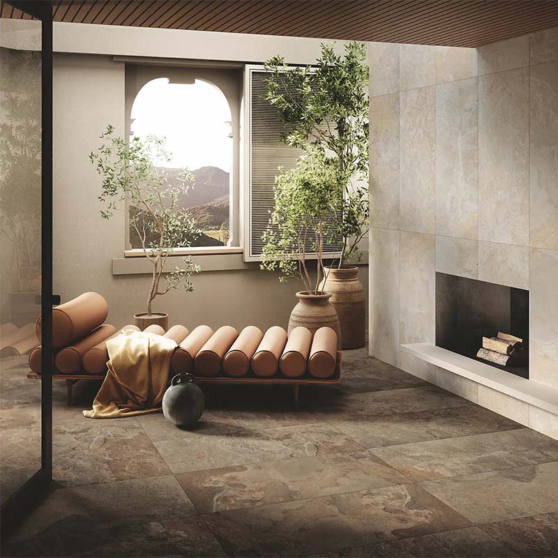 Die Slate-Kollektion umfasst drei monochromatische Farbtöne – Grey, Gold und Dark – die die Eleganz des Steins in seiner ganzen Natürlichkeit einfangen. Ergänzt wird diese Palette durch drei mutige Varianten: River, Natural und Flame, die der Kollektion eine moderne und lebendige Dimension verleihen.
