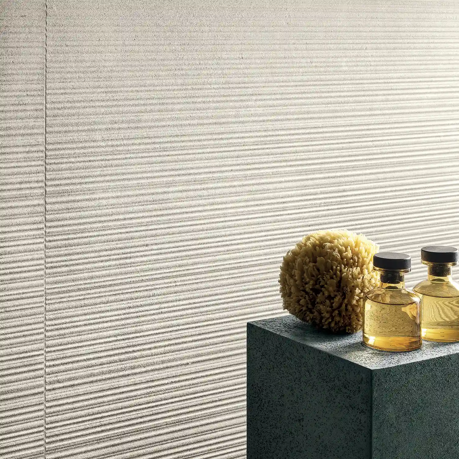 Dank der neutralen Farbwelt lässt sich das 3D-Dekor vielseitig kombinieren – von ruhigen Ton-in-Ton Gestaltungskonzepten bis zu kontrastreichen Materialmixes mit Holz, Metall oder Betonoptik. Besonders stimmig wirkt es im Zusammenspiel mit den Pietra di Portland Basisfliesen, etwa um elegante Übergänge und ein harmonisches Gesamtbild zu schaffen. So entsteht eine Oberfläche, die Authentizität, Innovation und visuelle Wirkung in einem klaren Design vereint.